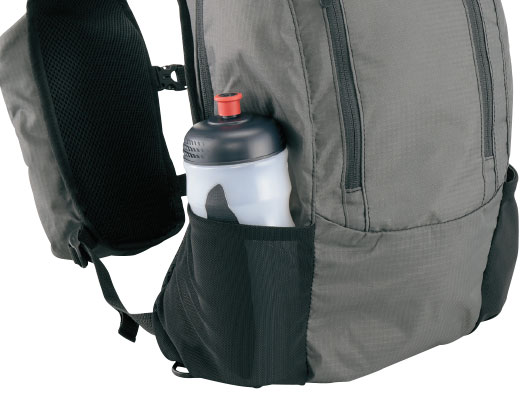 ●サイドにはパワーネットメッシュを使用したドリンクホルダーを配置。上部をゴム仕様にすることで本体のペットボトルの飛び出しを防ぎます。
