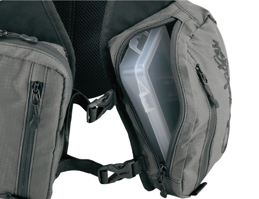 ●左右のフロントポケットは約21cm×12cm×5cmの大容量ポケットを採用。釣りに使用するプラスチックケースをすっきりと収納できます。