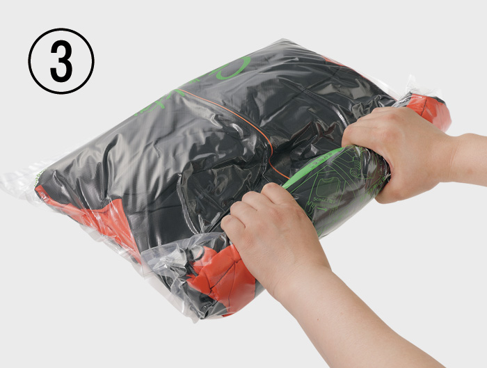 3.チャック側から袋をしっかり押しながら巻いていき、反対側の逆止弁から空気を抜いてください。