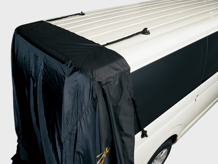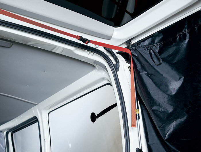 車のハッチバックを上げ、ベルトで固定。 ※ハッチバック固定ベルトは本体内側に2本配置しています。カラーを合わせて止めてください。