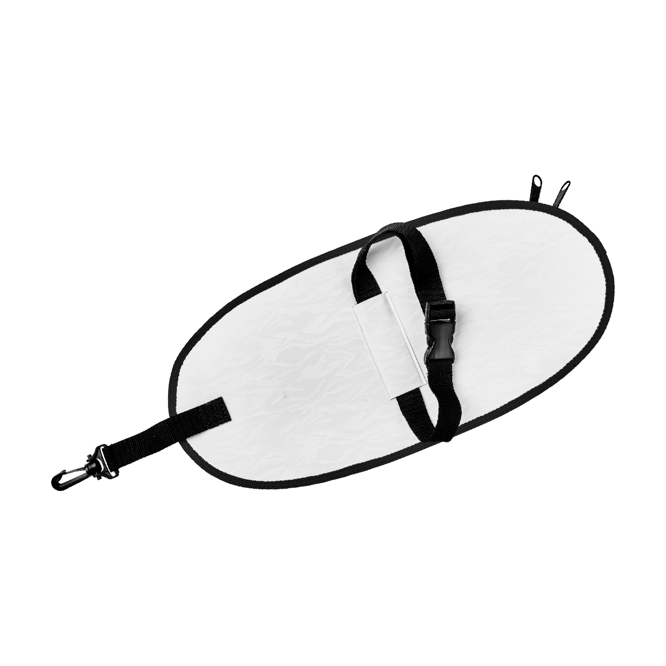 ●背面にはロッドケースなどに取り付けやすいベルトを装備。タモカバーのぶらつきを防止。