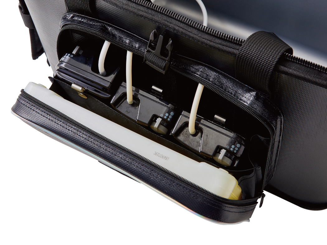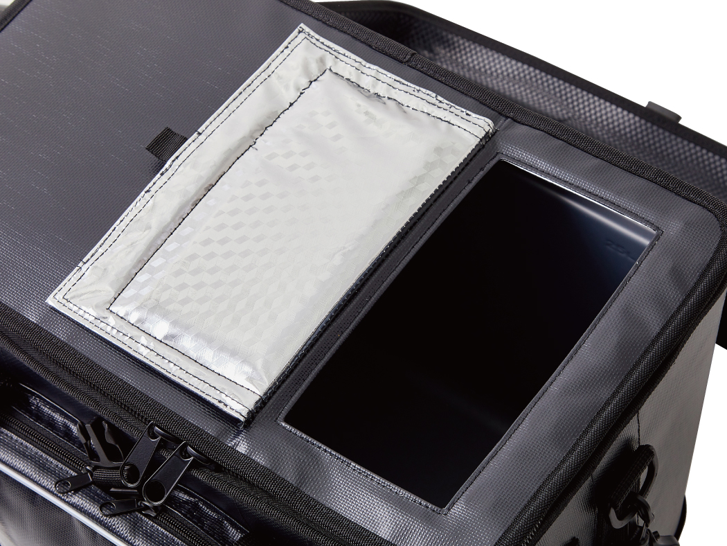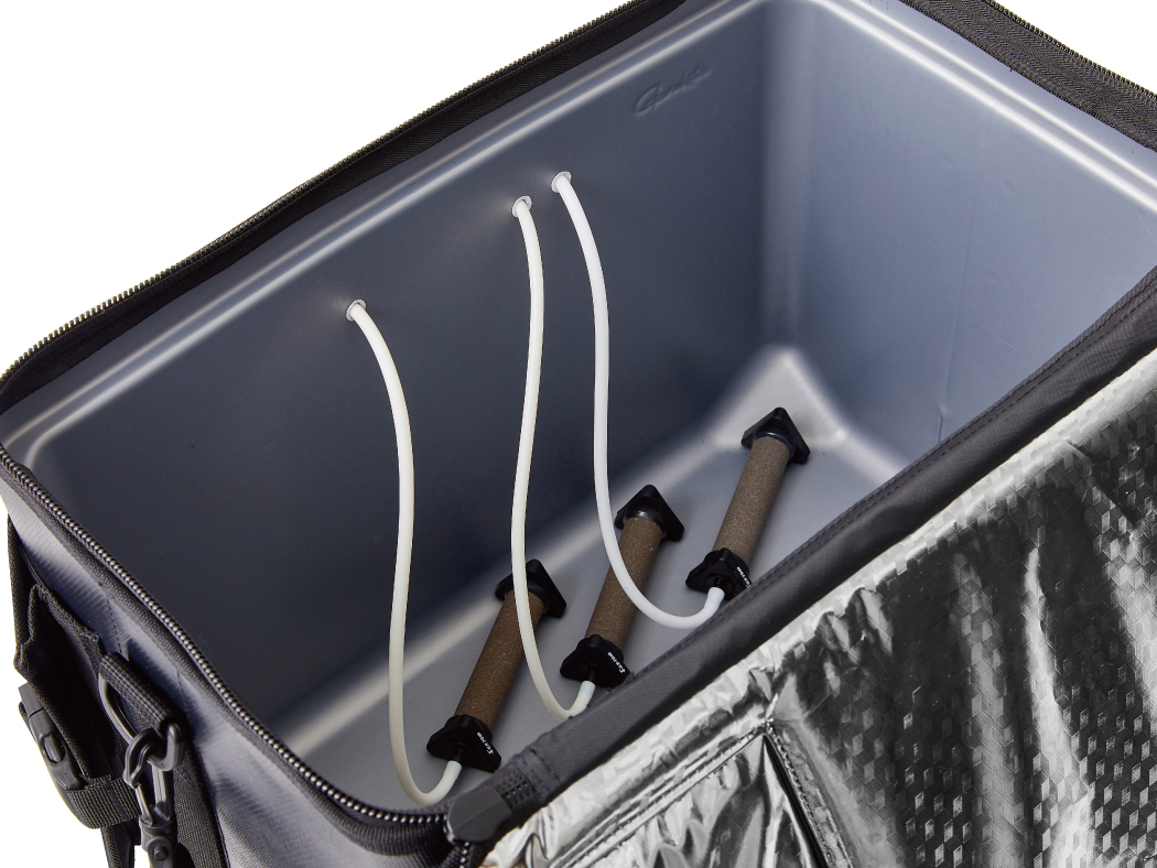 ●水温の上昇に影響するエアポンプからの外気を冷やすためにポンプポケットを2層に設定。内側にポンプを入れて外側にハードタイプの保冷剤を収納することでポンプを冷やし水中へ送り込む空気を冷やすことが可能。冷やした空気を水中に拡散することで内部の水温上昇を抑えます。