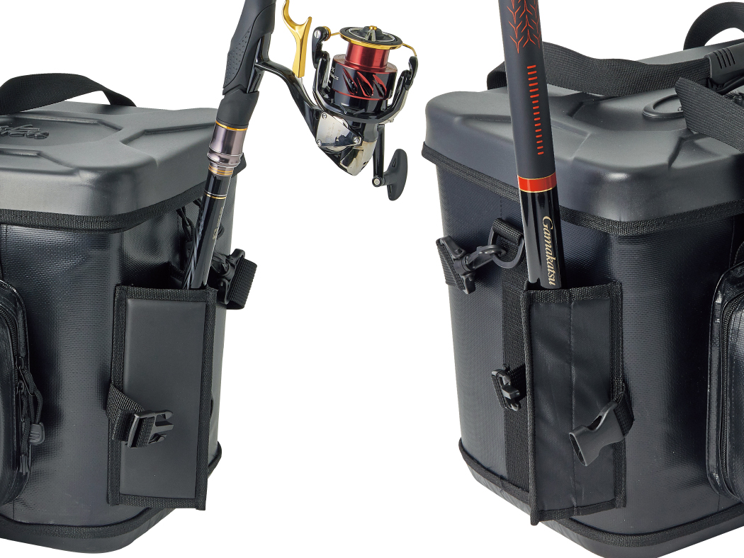 両サイドにはロッドスタンドを採用。タモの柄などをまっすぐ立てれるストレートタイプとセット済みの竿の糸がらみを軽減する5度角度を付けたナナメタイプを配置。