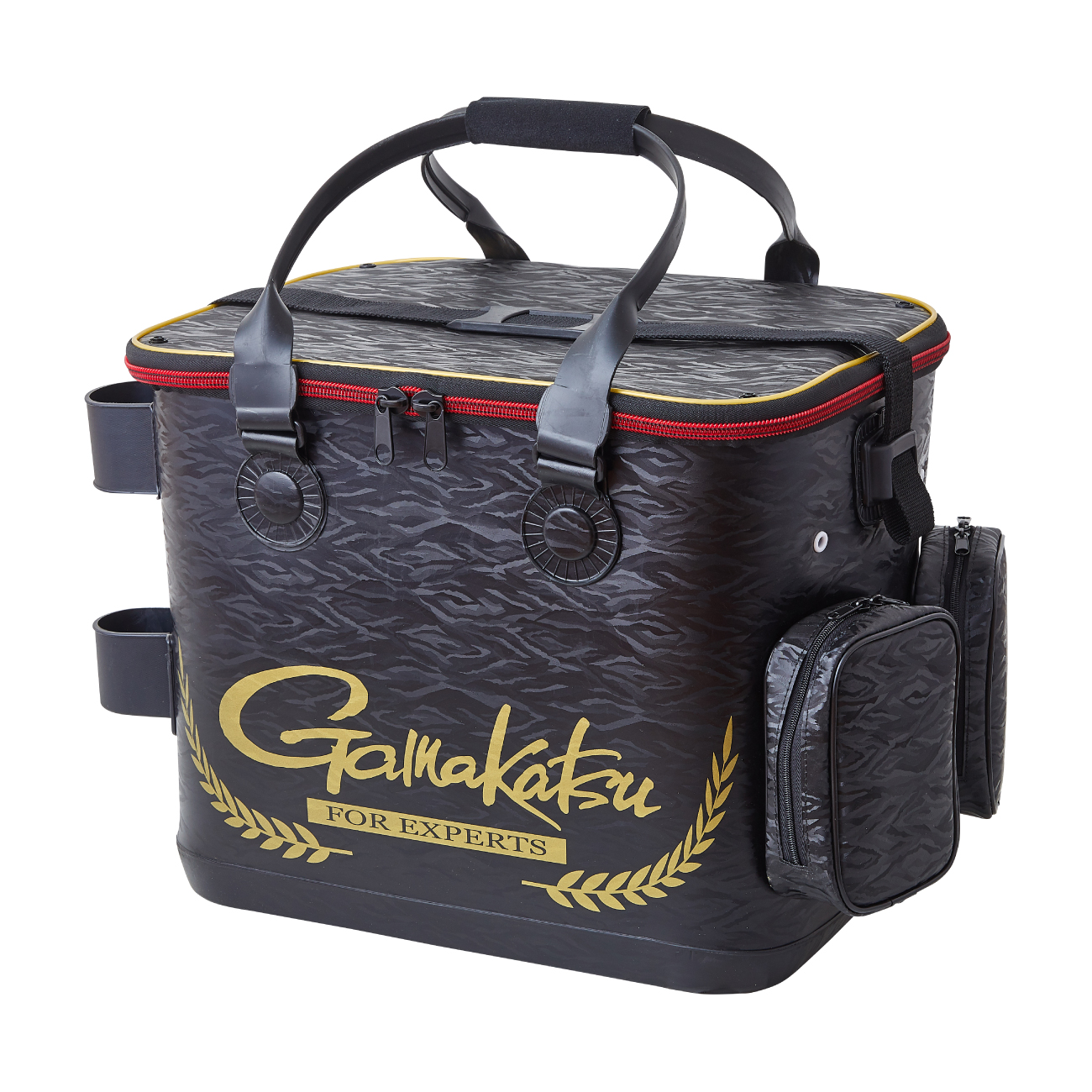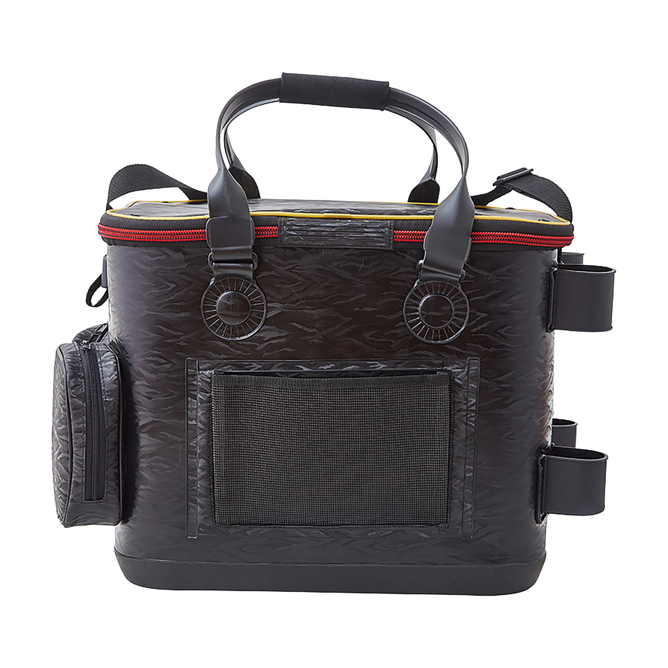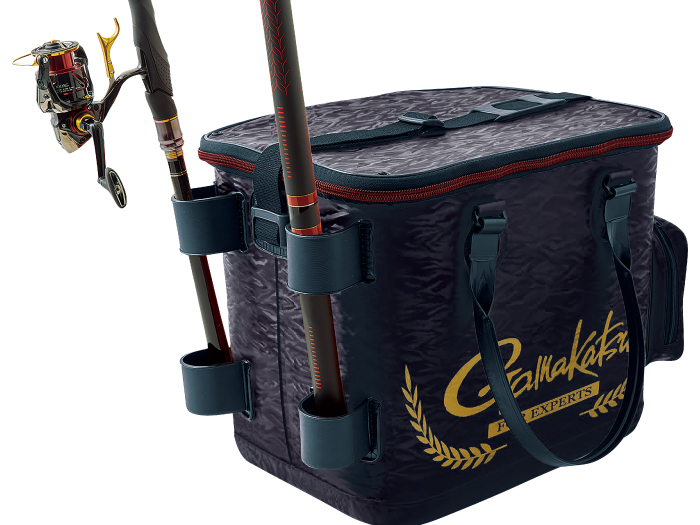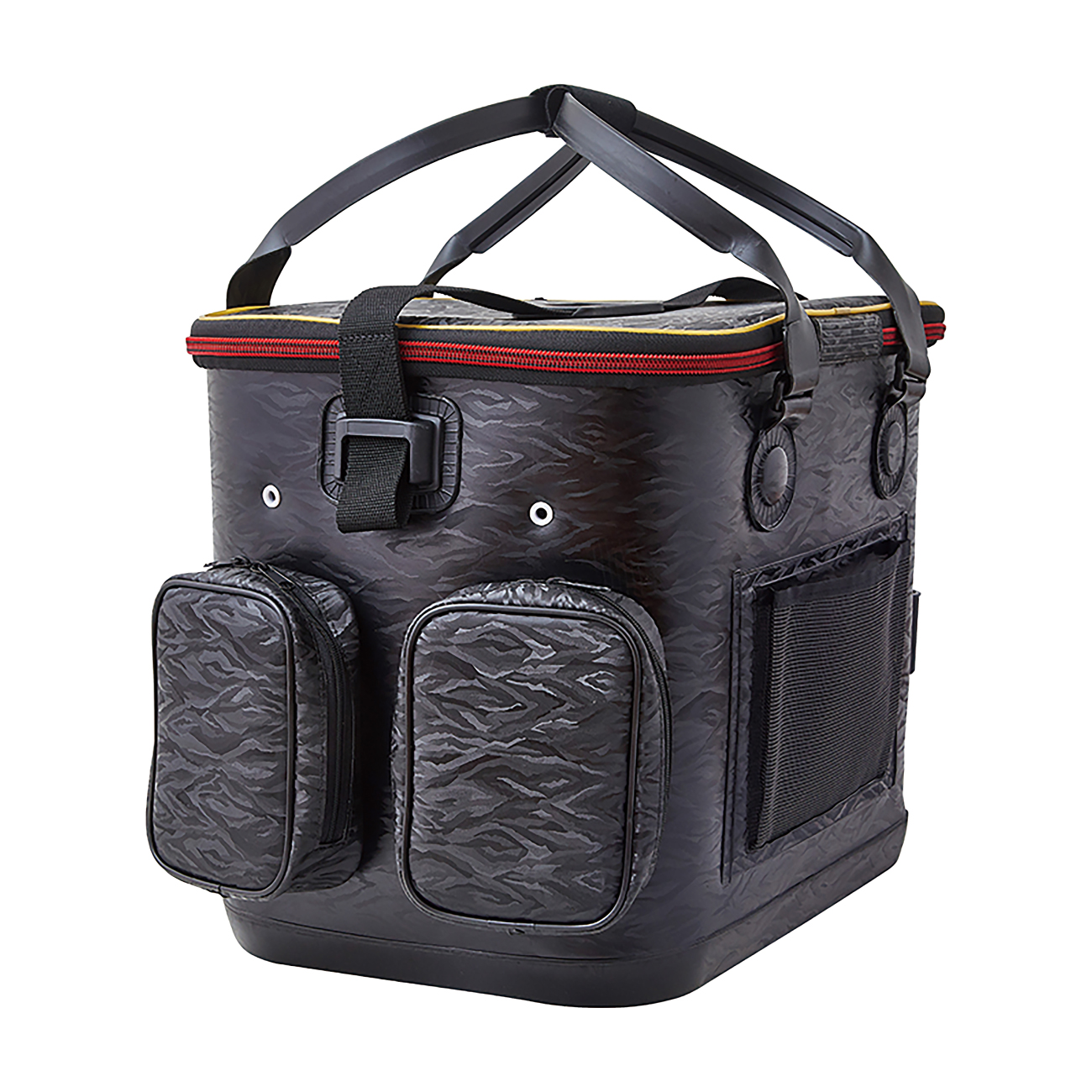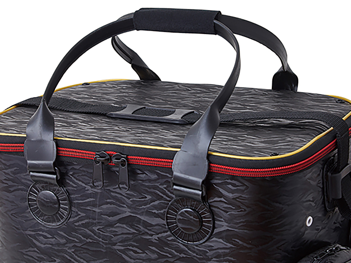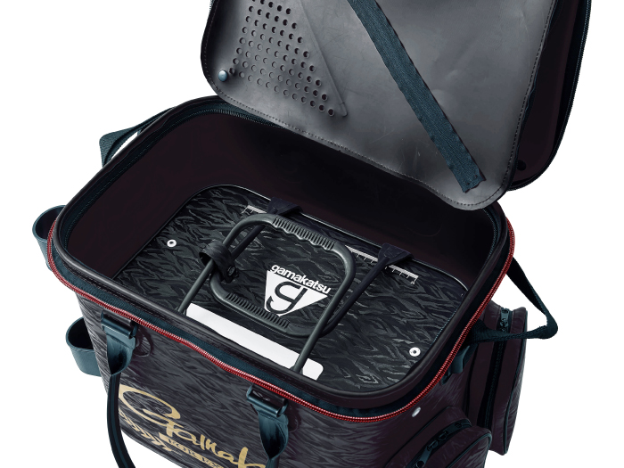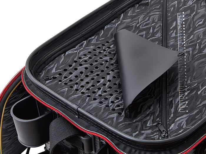 ●斜めのファスナーからスムーズな魚の投入が可能。水切り穴を採用し、魚を活かしたまま水換えをする際に便利。
