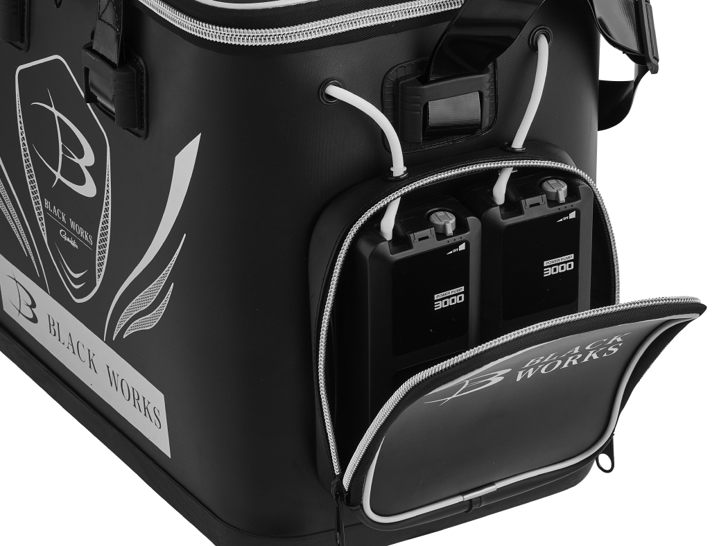 ●斜めのファスナーからスムーズな魚の投入が可能。水切り穴を採用し、魚を活かしたまま水換えをする際に便利。