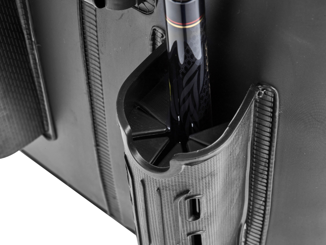 ●二つのロッドスタンドのうち一つを新形状のロッドスタンドを採用。竿を立てたときに内側の弁でしっかり竿を保持するため、風などで竿がぐらつくのを防ぎます。