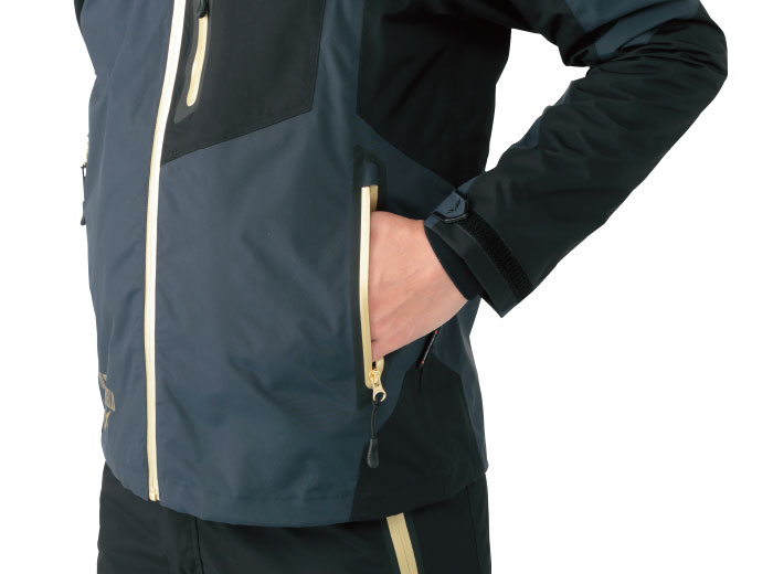 ●ジャケット袖口部はダブルカフスを採用し、雨天での釣行時でも袖口からの雨の浸入を大幅に減少させます。インナーカフスは手首へのフィット感を向上させるストレッチカフス仕様。