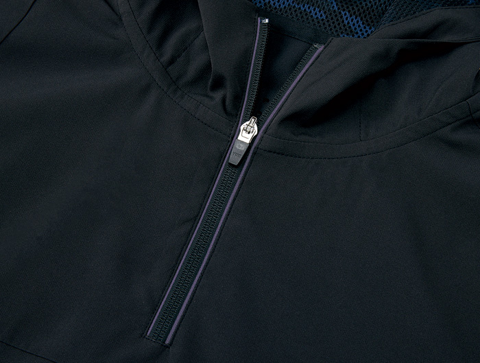 ●従来のウィンドブレーカーと違うところは、風を完全にシャットアウトせずある程度の通気性を持つように設定している点にあります。ある程度の風の浸入をさせることにより、外気を取り込んで温度が上昇したウエア内のクーリングや外気が上がりウエア内部にこもった熱を外部に放出することが可能。