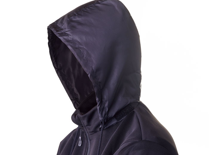 フード部分は襟裏に収納可能。収納した場合でも襟部が分厚くならないように設定しています。