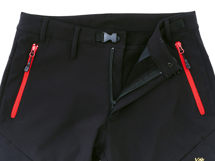 3D立体カッティングを施した動きやすいストレッチパンツ。内側にフリース生地を配し保温性を高めるとともに、防風透湿ラミネートフィルム入りで風をバッチリ防ぎます。また、ウエストのポケットはもちろん、スマホなどを入れるのに便利な腿部にもポケットを設けています。取り外しができるアジャスターベルトとヒップガード対応ベルトループ付。フロントファスナー仕様。
