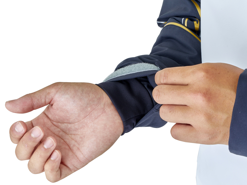 ●ジャケット袖口はダブルカフス仕様。インナーカフスにストレッチ素材を使用することでフィット感を高め水の侵入を防ぎます。