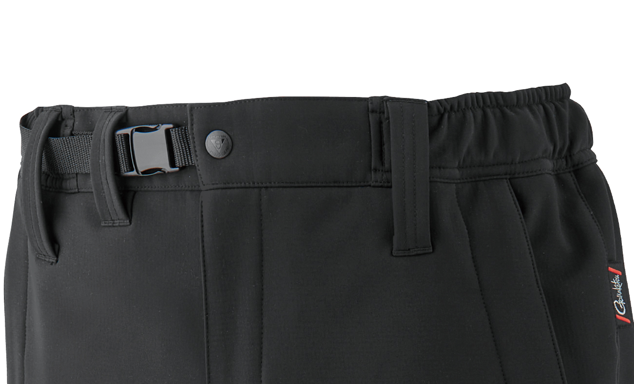 オフセット配置したベルトバックル。ウエストはゴムシャーリングとアジャスターベルトでしっかりフィット。ヒップガード用フロントベルトループ付。