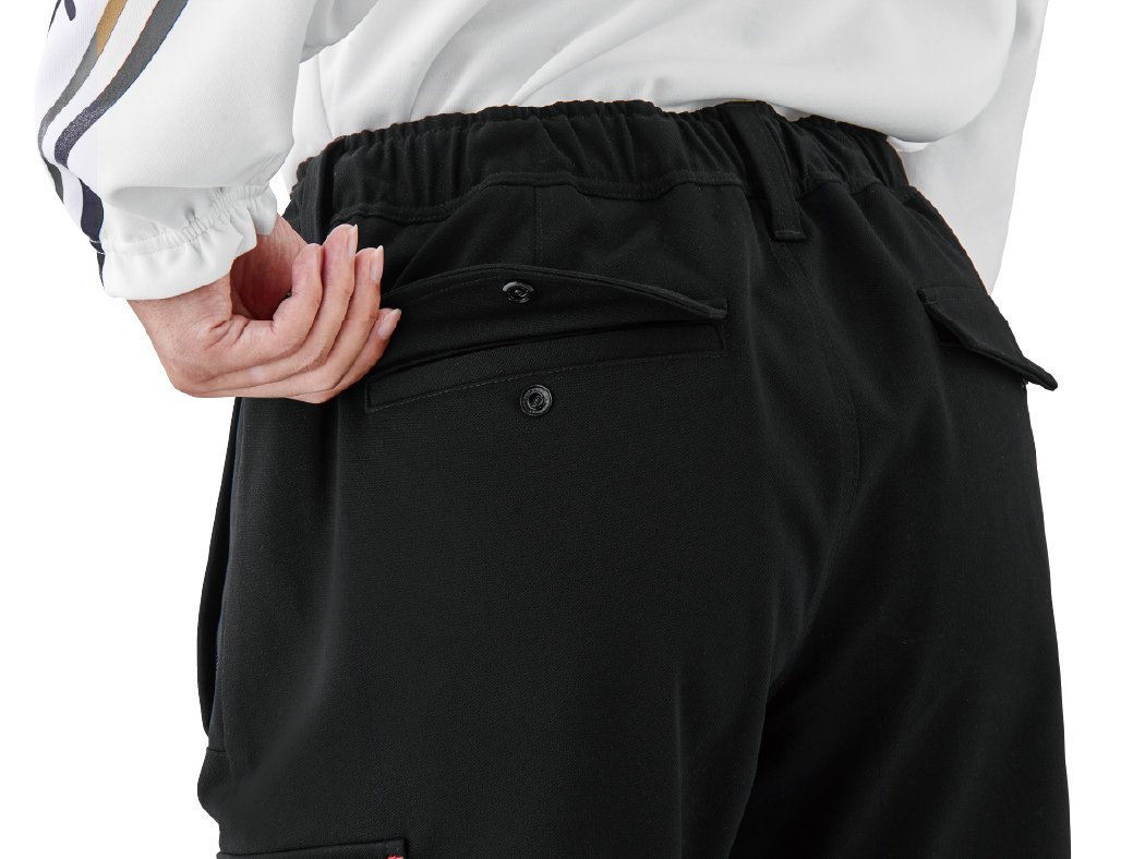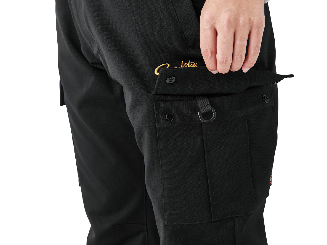 ●両サイドには大型カーゴポケットを配置。ポケット内にはD環を装備し尻手ロープなどと接続して使えます。