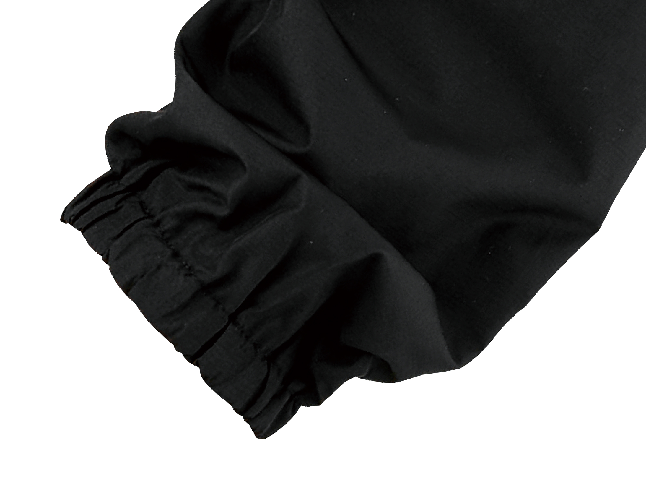 袖口はゴムシャーリングで腕まくりがしやすい仕様。