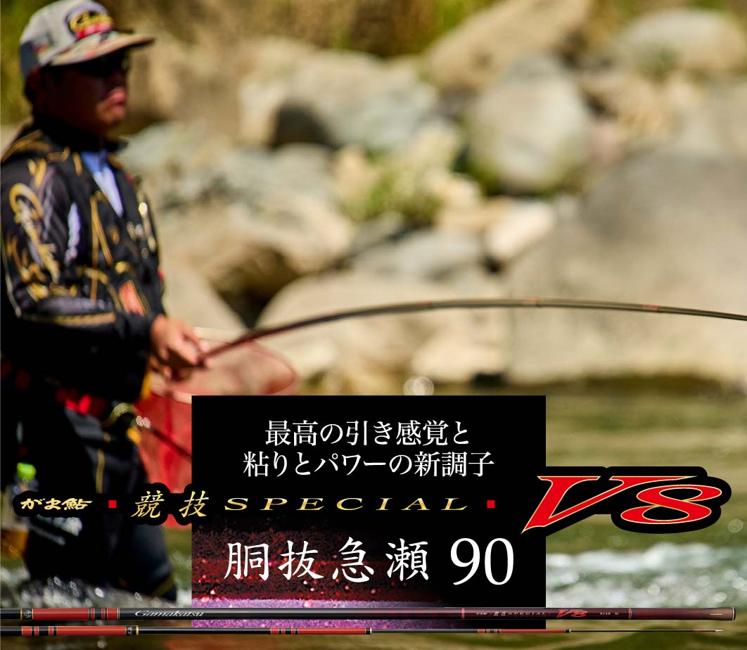最高の引き感覚と粘りとパワーの新調子 がま鮎競技スペシャルV8 胴抜急瀬 90