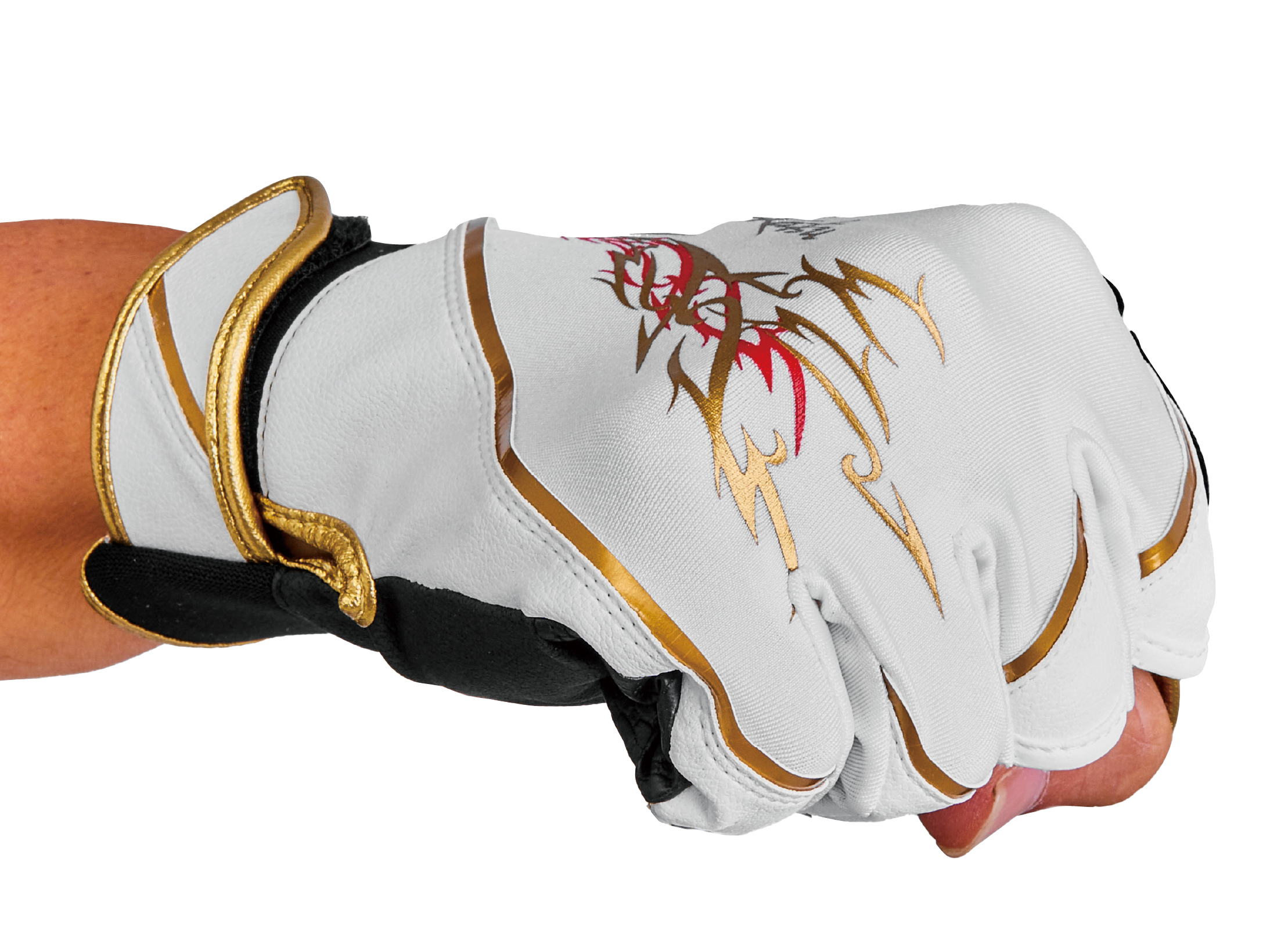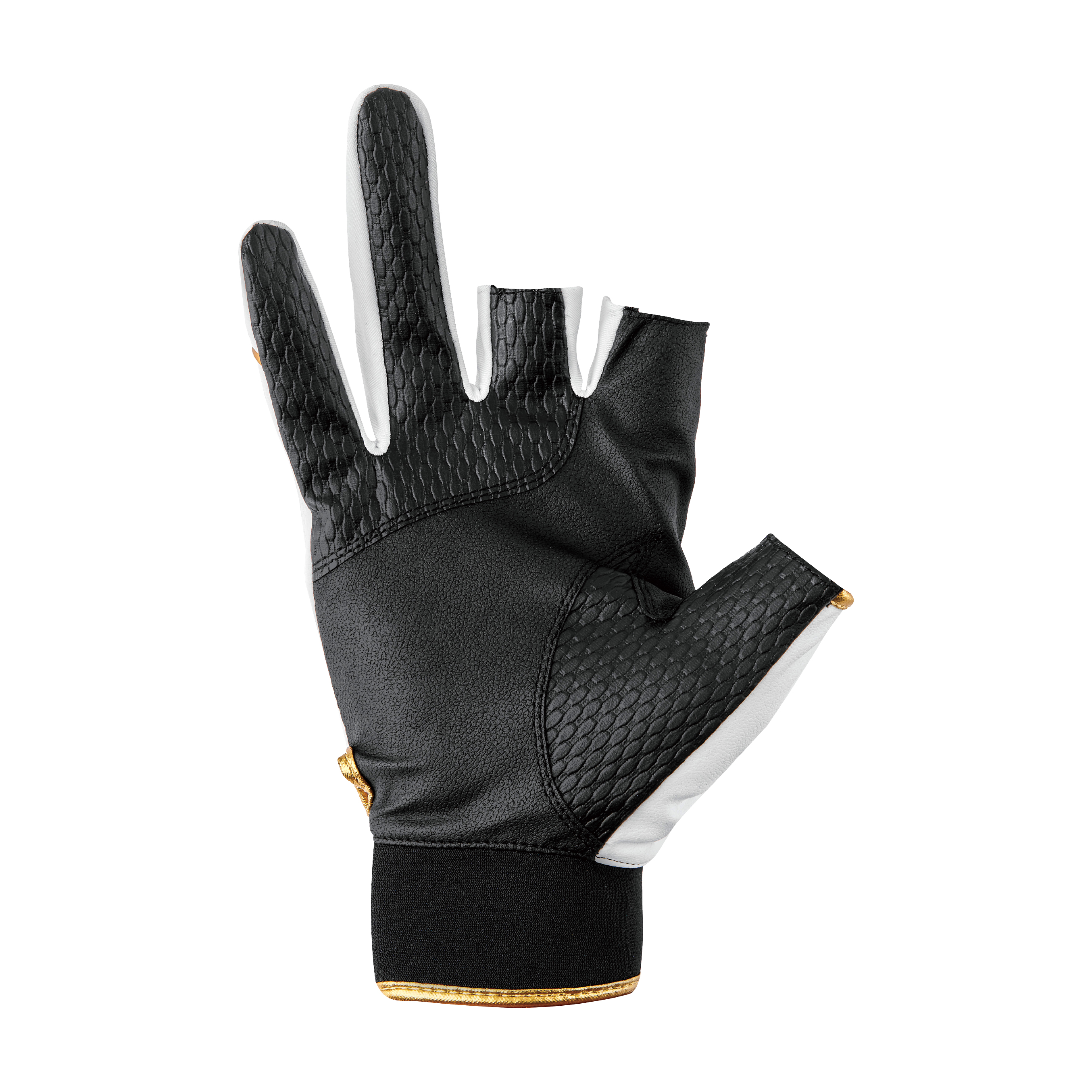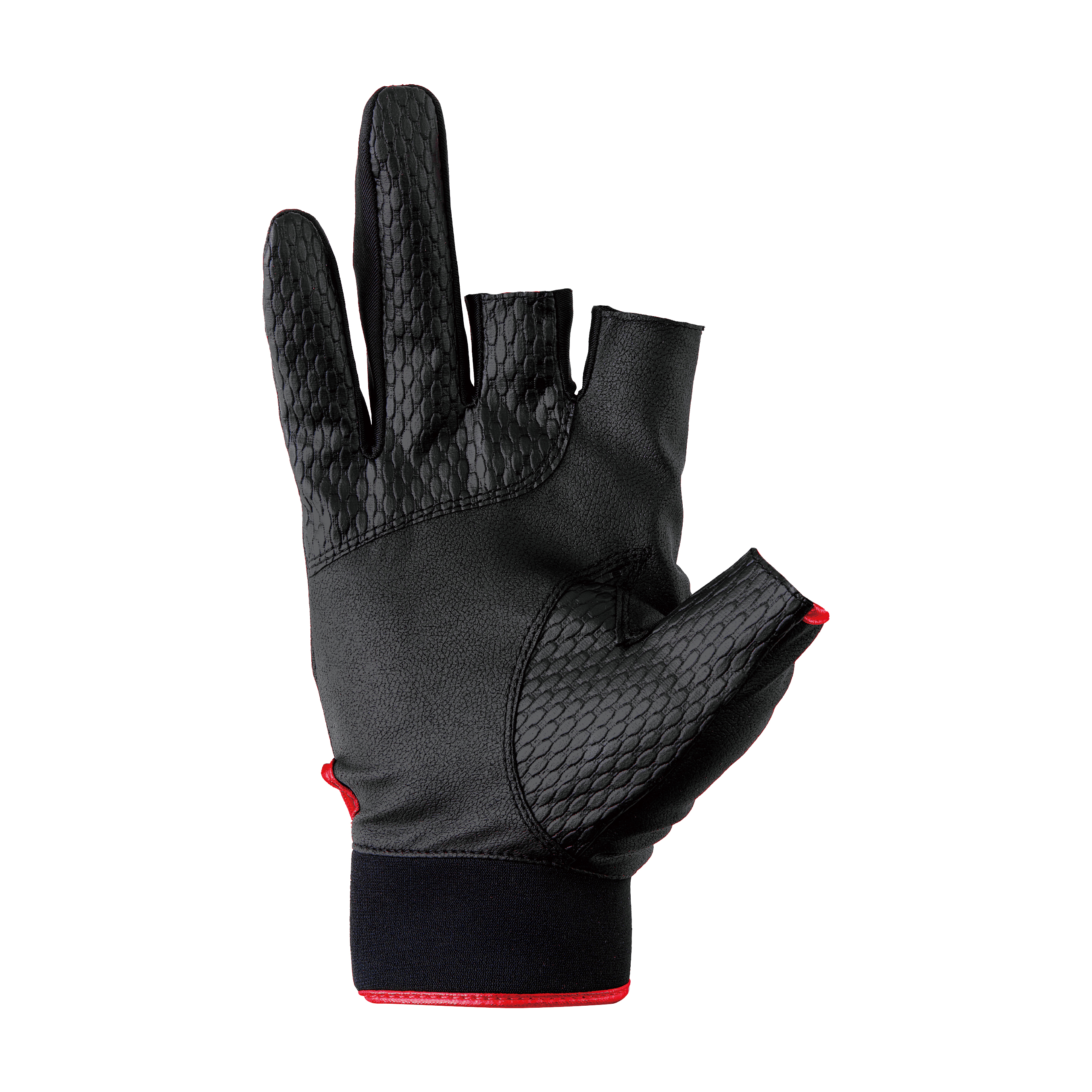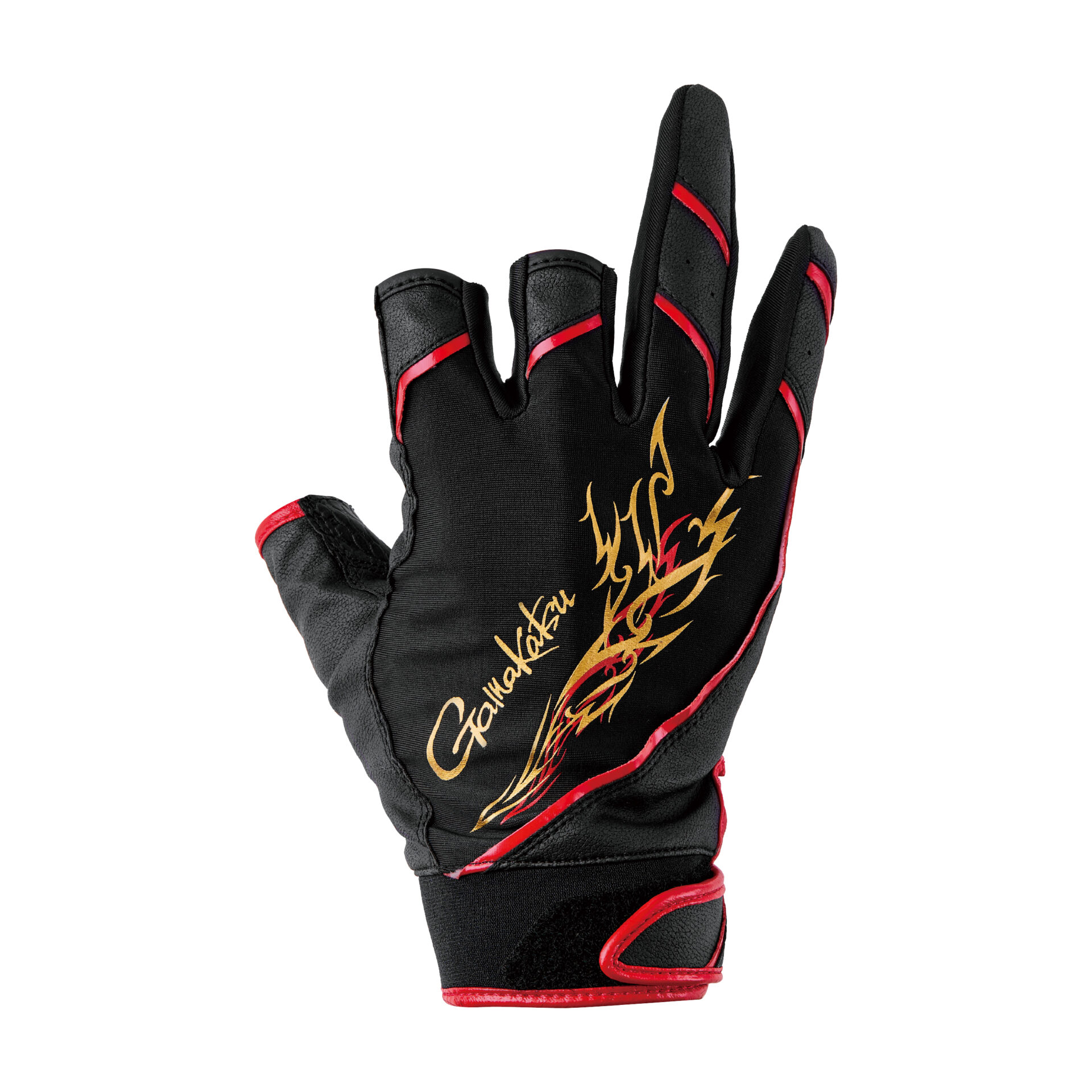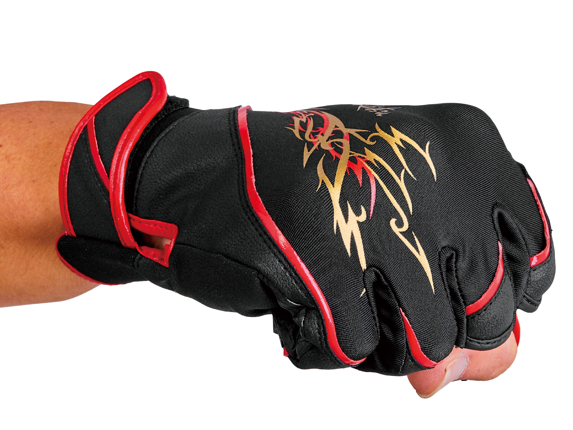 ●“渋派手”の炎デザインをプリント加工にし、面ファスナー採用でさらに疲れにくさやフィット感にこだわりました。また、ロッドやまき餌杓などを握りやすいように3本切の指部分(掌側)をカーブ状に設計しています。