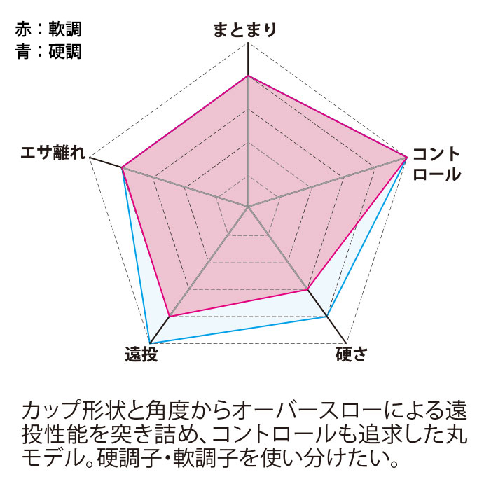 撒き餌をより「楽」に「遠く」に「正確」に飛ばしたいという開発コンセプトから、独自に開発を重ね半球型のカップにたどり着きました。この新たなカップを自在に操ることにより、高い遠投性能を発揮するだけでなく、風に負けない力強い直進性の撒き餌を投げることができるようになります。また先調子のシャフトとの組み合わせで遠投時に力を入れなくてもラクラク遠くまで撒き餌を打つことが可能です。カップ内側にあらかじめ溝加工を施すことで完璧な撒き餌離れを実現するとともに、カップのエッジを鋭くしたMCES(マキエカッターエッジシステム)で、バッカンから撒き餌をすくうときの切れも向上。リリーススケールメジャー機能付き。