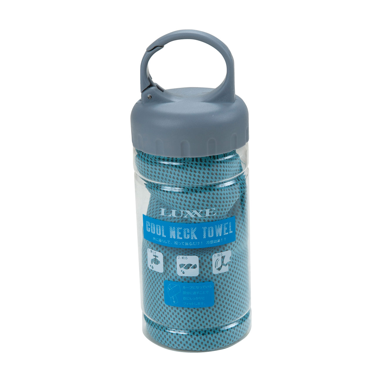 水で濡らした後、軽く絞って水滴をなくすように数回振り、首に掛ければ気化熱効果で首元ひんやり!ループになっている部分に通すことで、首にしっかりとフィットさせることが出来、タオルと首の接地面積が広がります。更に、釣り場での急な突風が来ても飛ばされる心配がありません。便利なカラビナ付ボトルで、水を入れて持ち運び可能。水道がない場所でも使用可能。水や冷水を入れることで何度でも冷やして使えます。