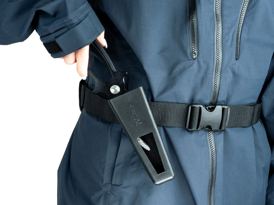 フラップのサイドホールにライフジャケットやベルトなどを通し、装着。