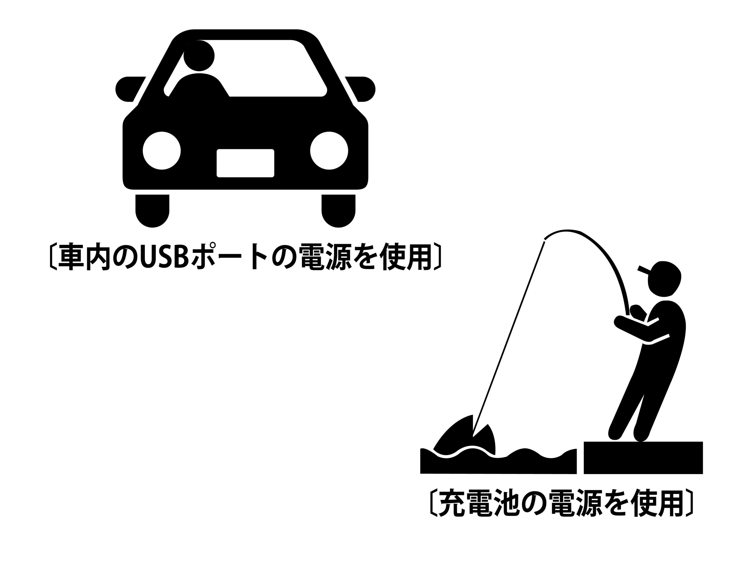 釣り場までは、車内のUSB電源を使用できます。3mのUSB-Cケーブル付属で、ラゲッジルームに置いた活き餌入りのバケットにも使用できます。