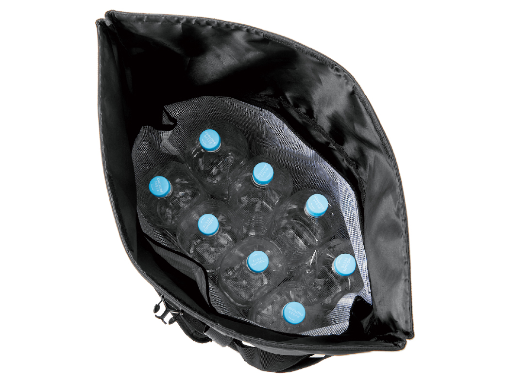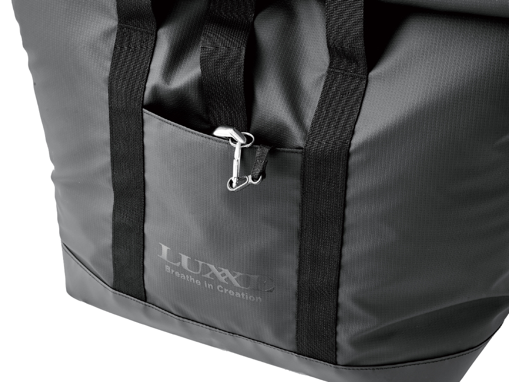 メインルームが大きく開き収納しやすく、中に氷や保冷剤を入れれば釣った魚を入れれる簡易クーラーとして使用できる最大46L(通常時は43L)の収納力あるトートバッグ。