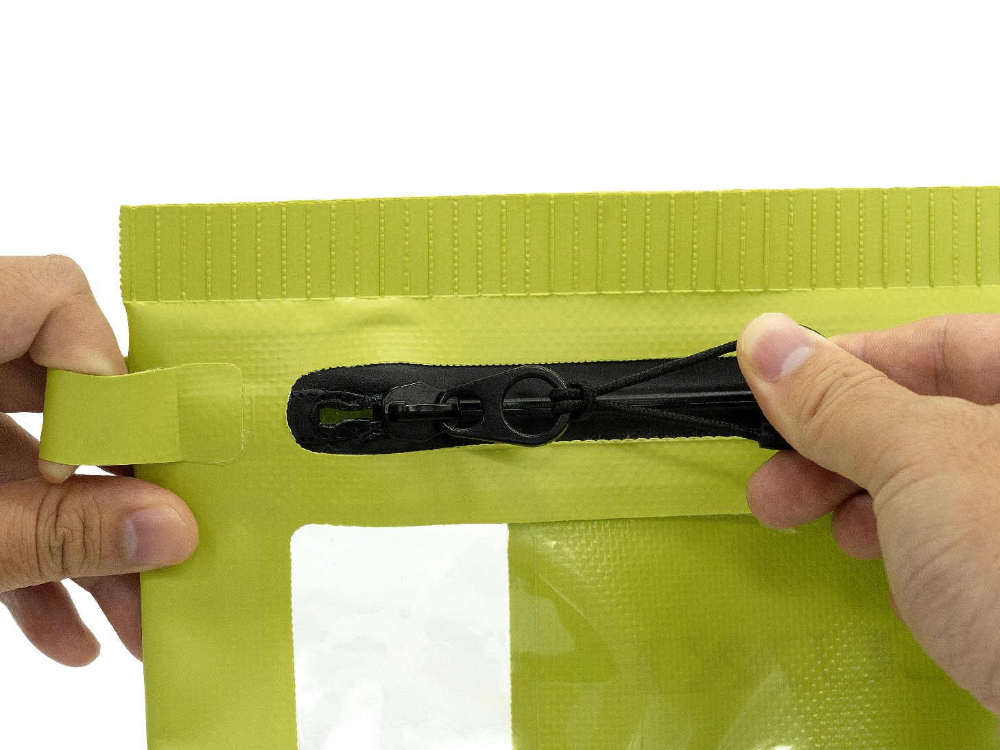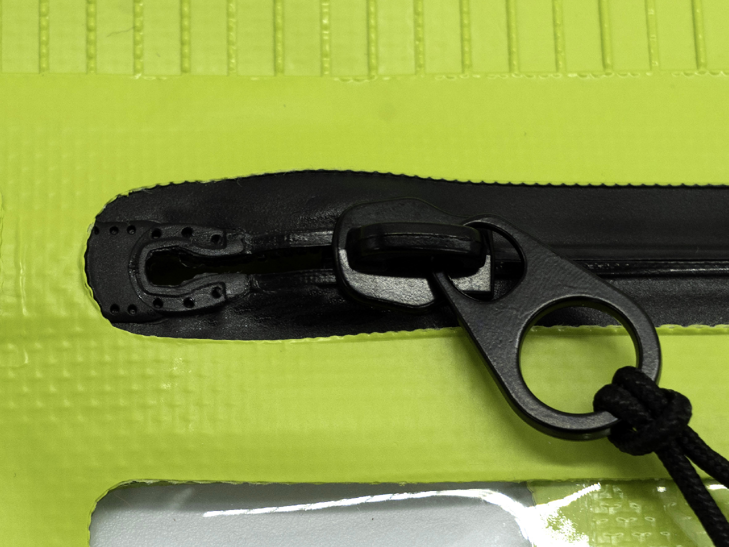 写真のようにファスナーが折れ曲がった状態での使用や保管は、防水機能の低下に繋がりますのでファスナー部分が折れ曲がらないようにご注意ください。