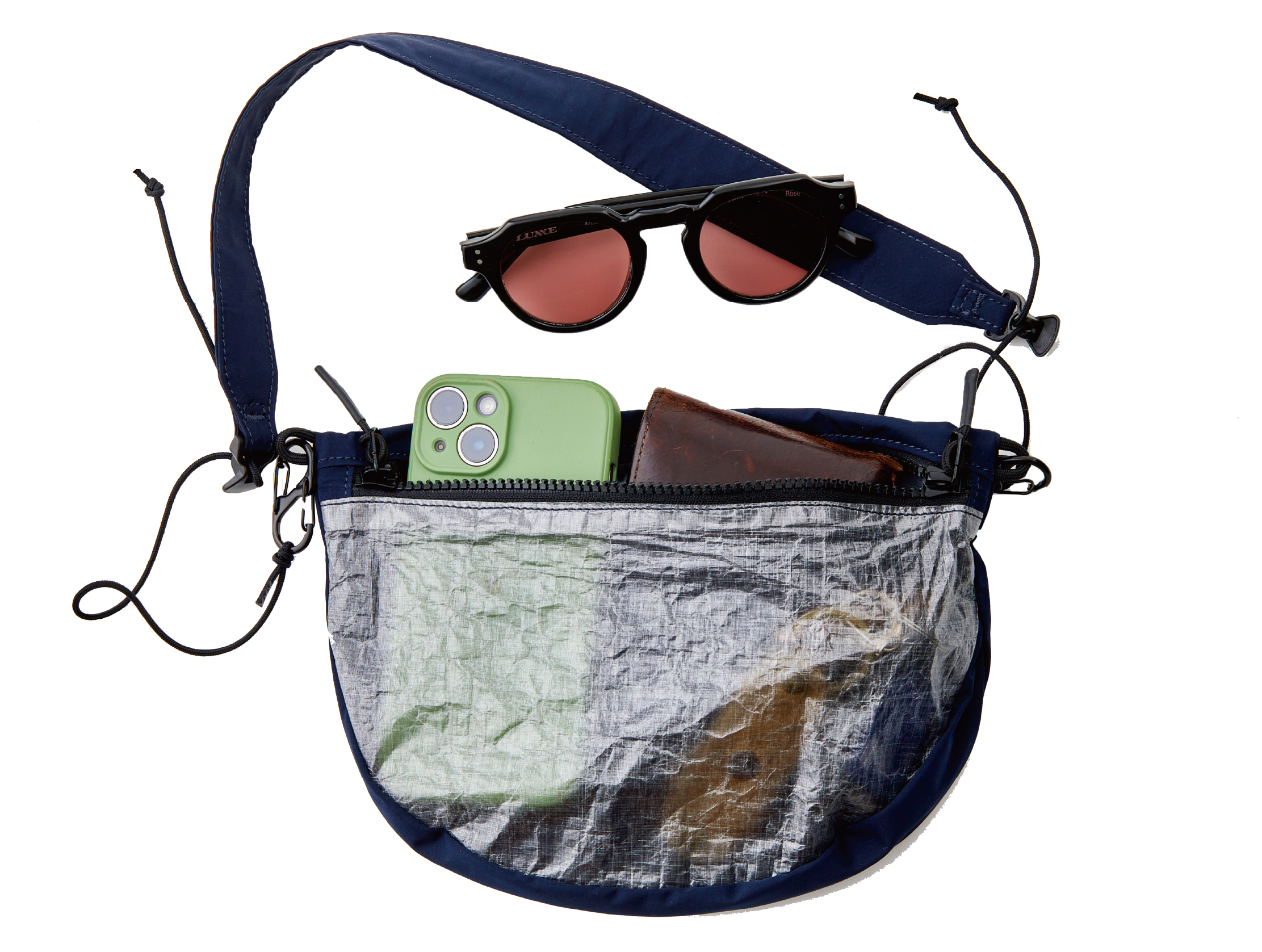 圧倒的な軽さと強さを持つDyneema(R)コンポジットファブリックを前面部分に採用しています。スチールの約15倍の強度を誇り、完全防水のこの素材は機能性はもちろんのこと、使うごとに皺(しわ)が入り独特な風合いを帯びていくのも楽しみの1つです。前面は半透明なので、何を入れたかをひと目で確認出来ます。また、荷物をサコッシュに入れたときに体側に重心が寄るように設計されたマチ構造により、前かがみになってもサコッシュがばたつかないので移動時の快適性も抜群です。