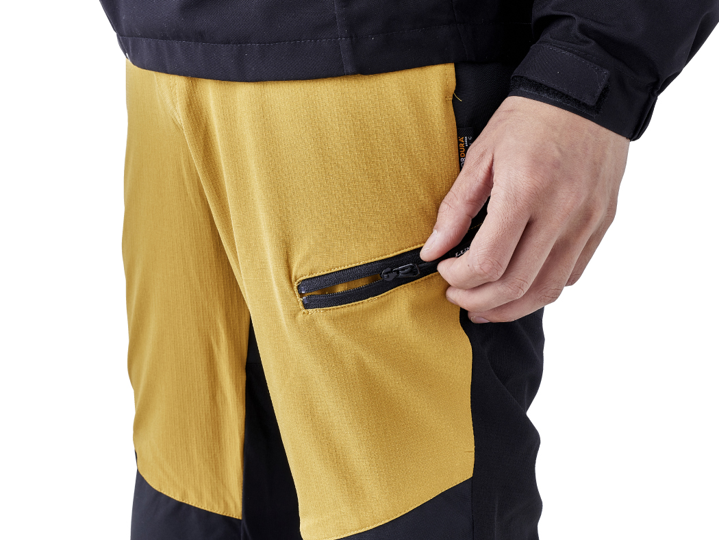 太もものポケットは落下防止にもなるファスナー付き。