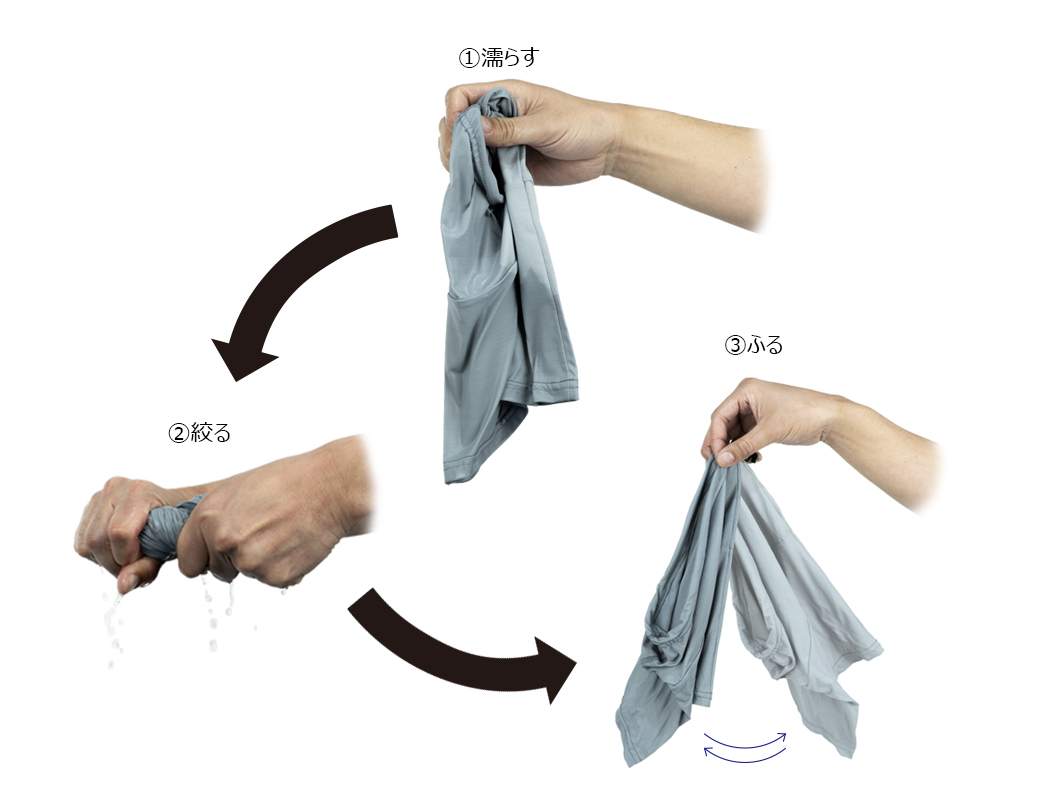 ”濡らす→絞る→ふる”ことでさらに「ひんやり」する快適素材。