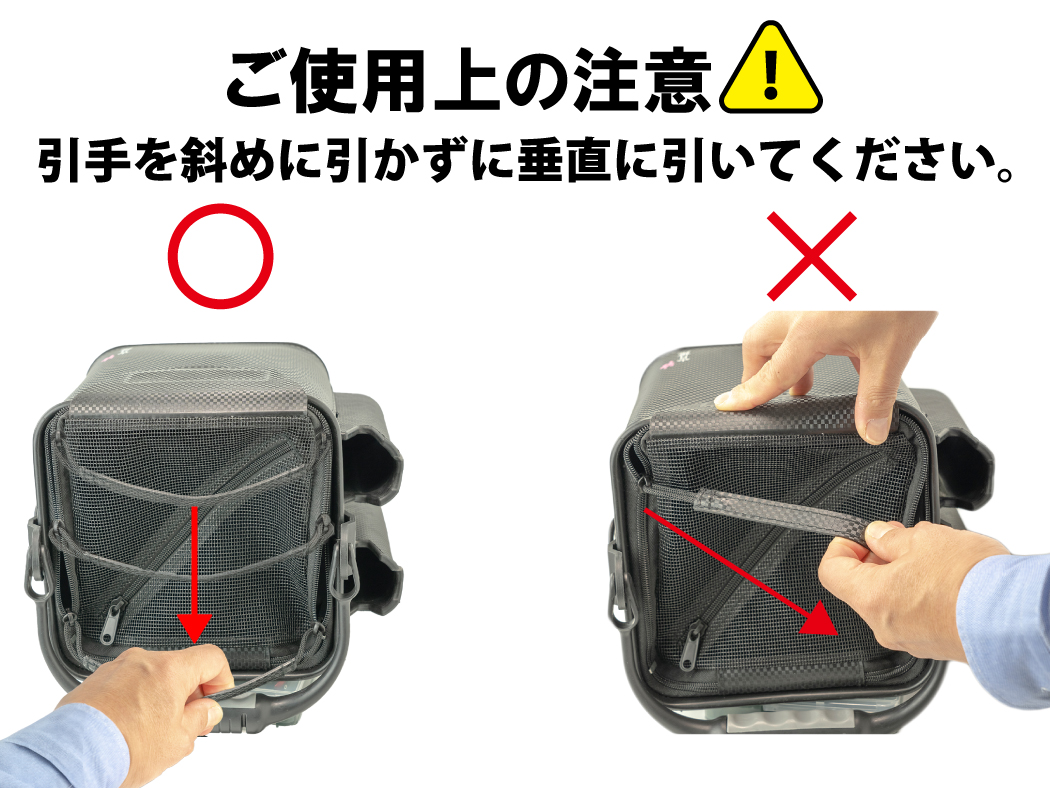 左右のスライダーを横向きに強い力で引いたり、水や魚が入った状態で引手を持って当製品を持ち上げると、ファスナ