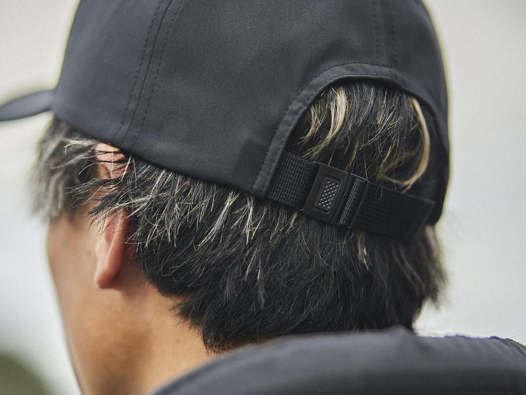 ●小雨の中、バイザー先から雨水の落下を軽減し、はっ水素材を採用したキャップ。ウェアに合わせやすいシンプル刺繍ロゴデザインでマルチなシーンで対応出来るアイテム。