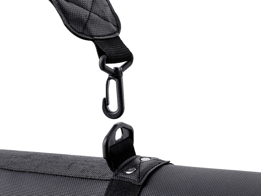 ロッド収納時のバランスを考慮したハンドル位置とショルダーストラップの長さで携行時の負担を軽減。ナスカン式で着脱が可能。
