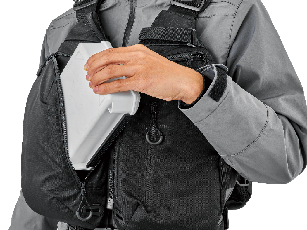 水辺を歩くことが楽しくなる工夫を凝らし、あらゆるフィッシングアクティビティに高い自由度で応える新しいカタチのライフジャケットです。