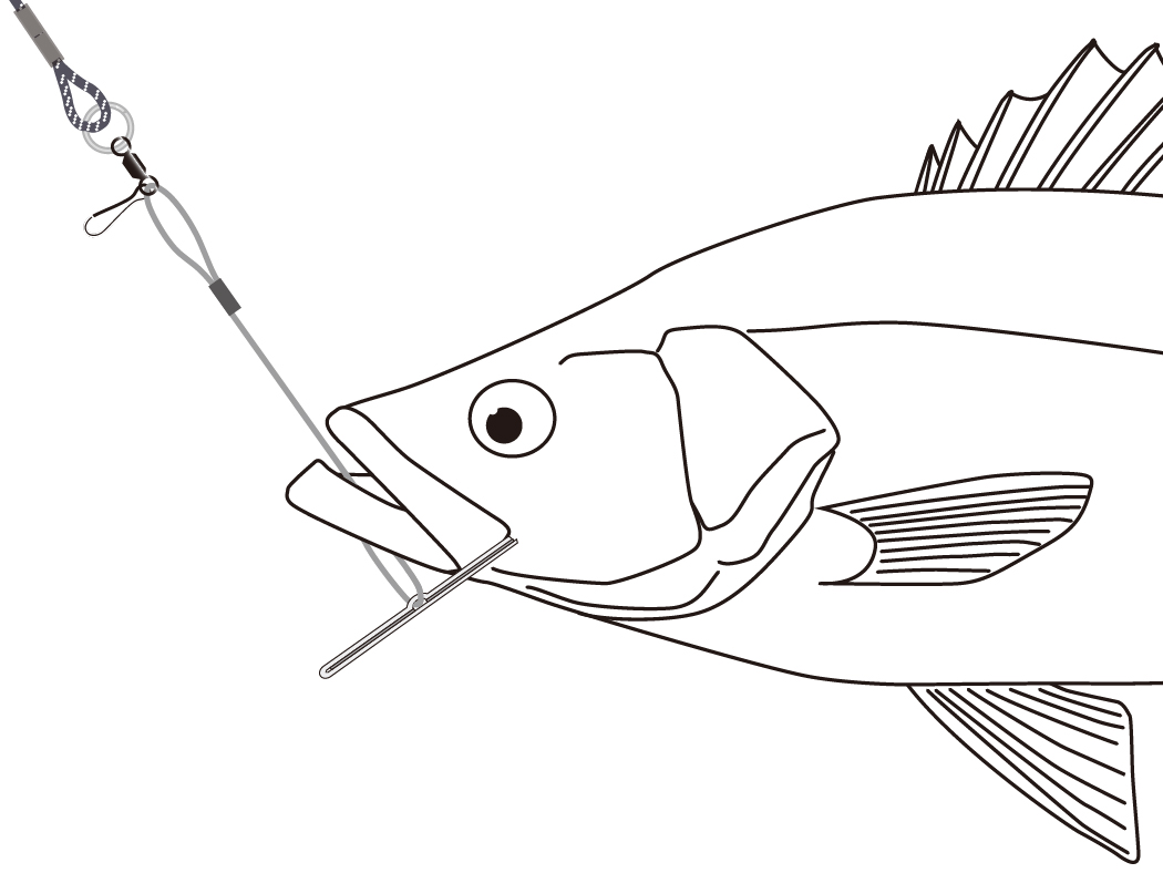 魚の下顎の薄皮部分にワイヤー通しを口の内側から外側に向けて貫通させます。貫通したらワイヤーに対して垂直にすると、下顎外側に引っ掛かり止まります。念のため、ストリンガーを引っ張っても抜けないことを確認し、魚を水に戻します。