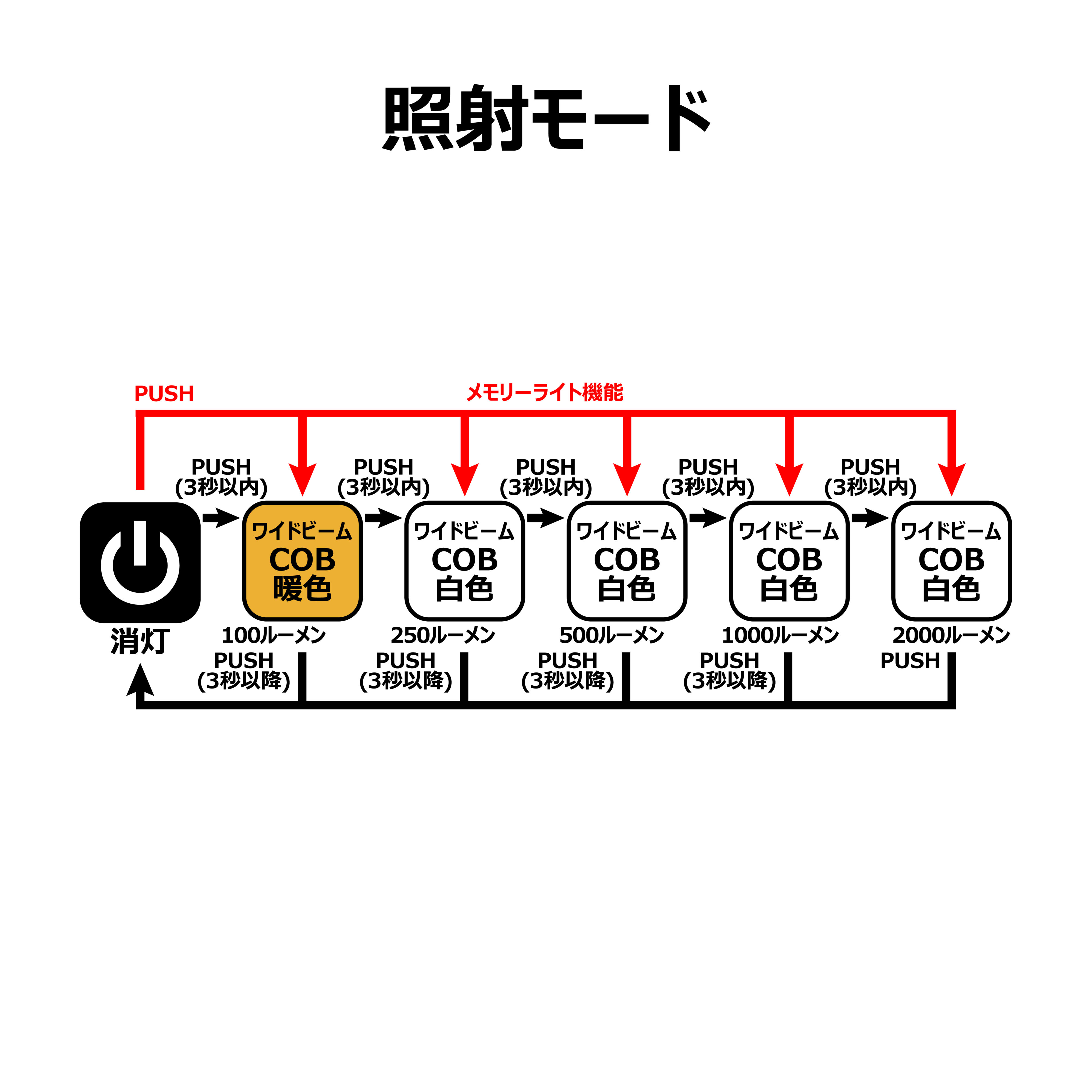 ●前回使用のライトから点灯するメモリーライト機能。