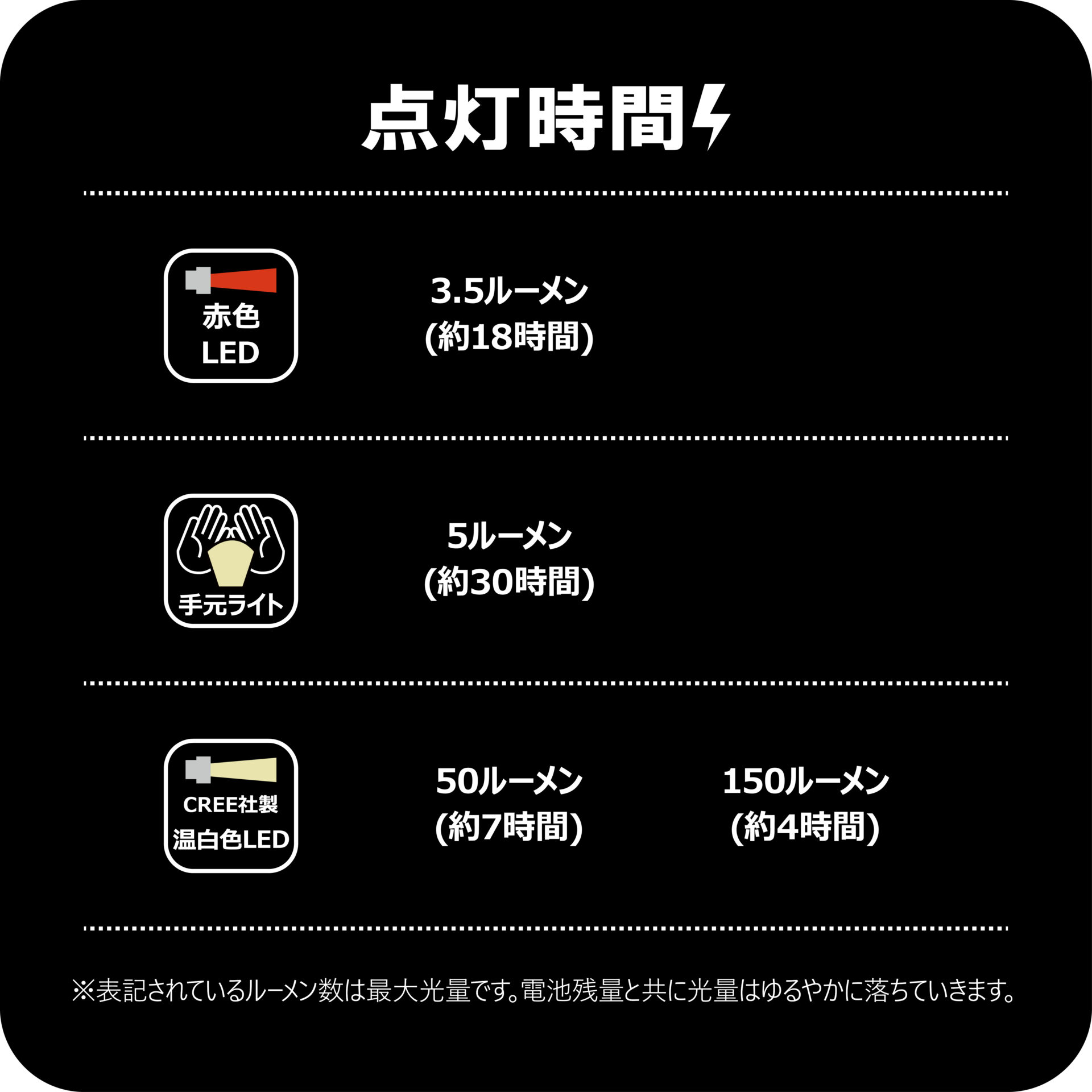 最大光量:150ルーメン