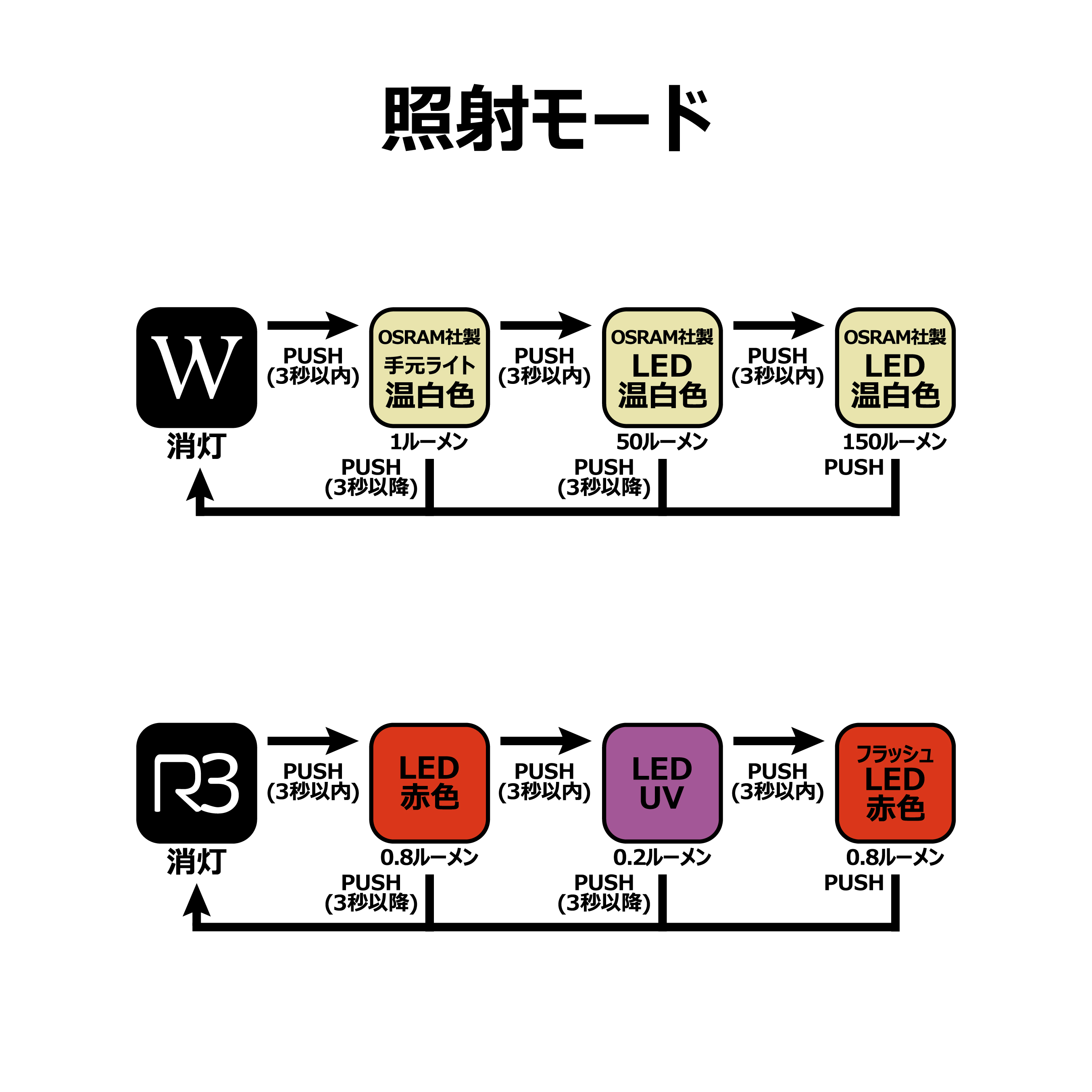 ●クイックオフ機能(3秒以降に1回押せば消灯)。