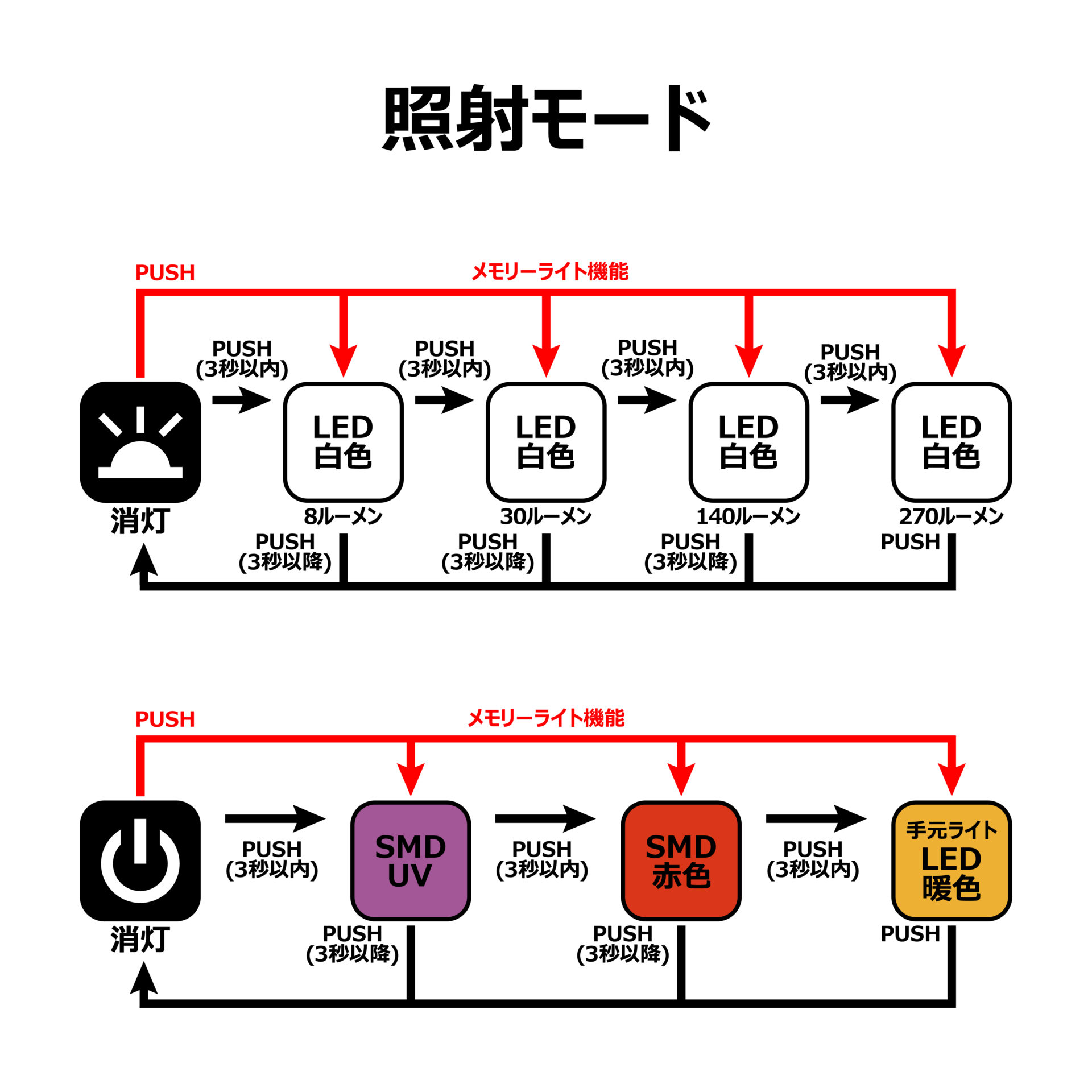 ●メモリーライト機能(前回使用のライトから点灯)。
