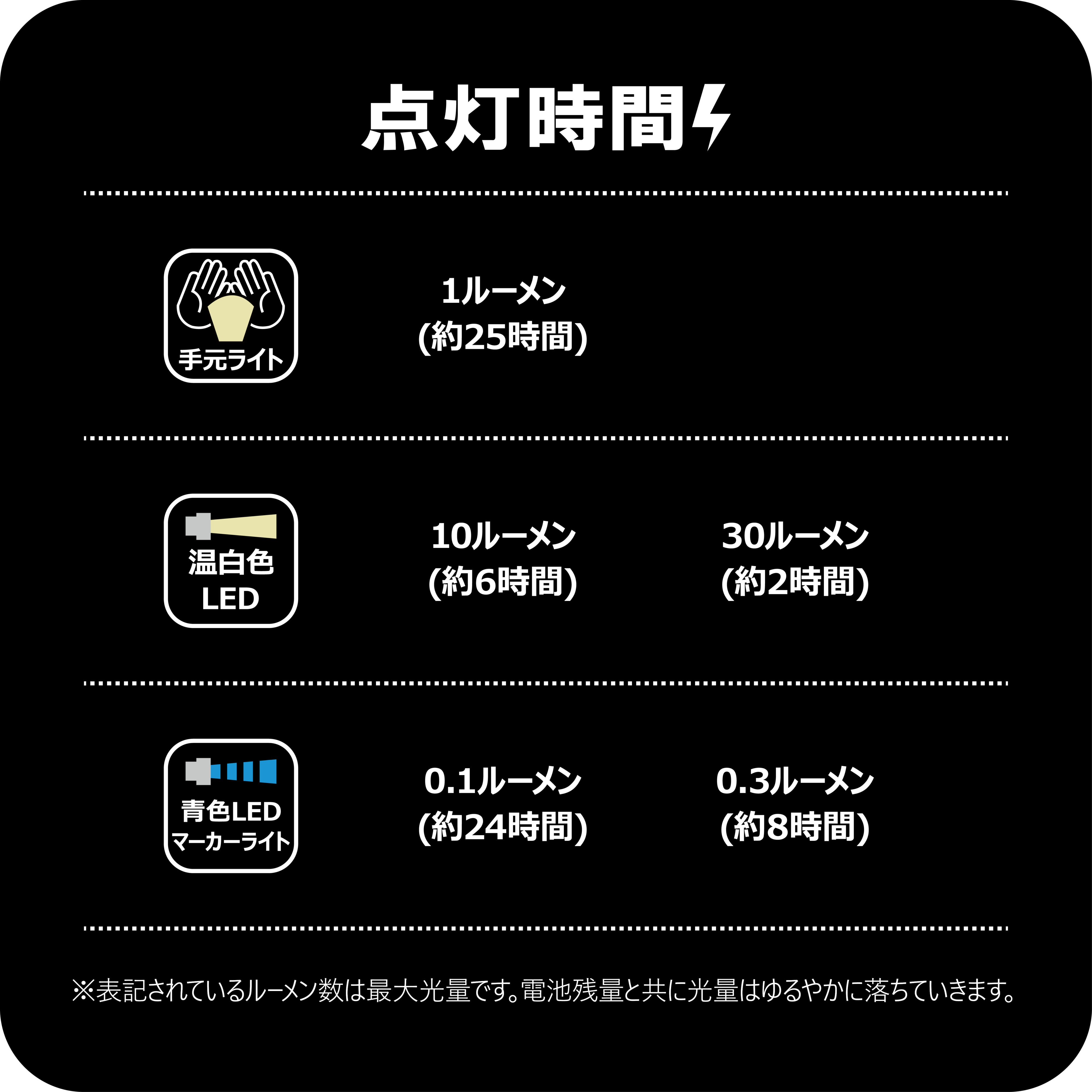 ●誤動作による点灯を防ぐロック機能付(1秒間に2度押しでロック解除)。