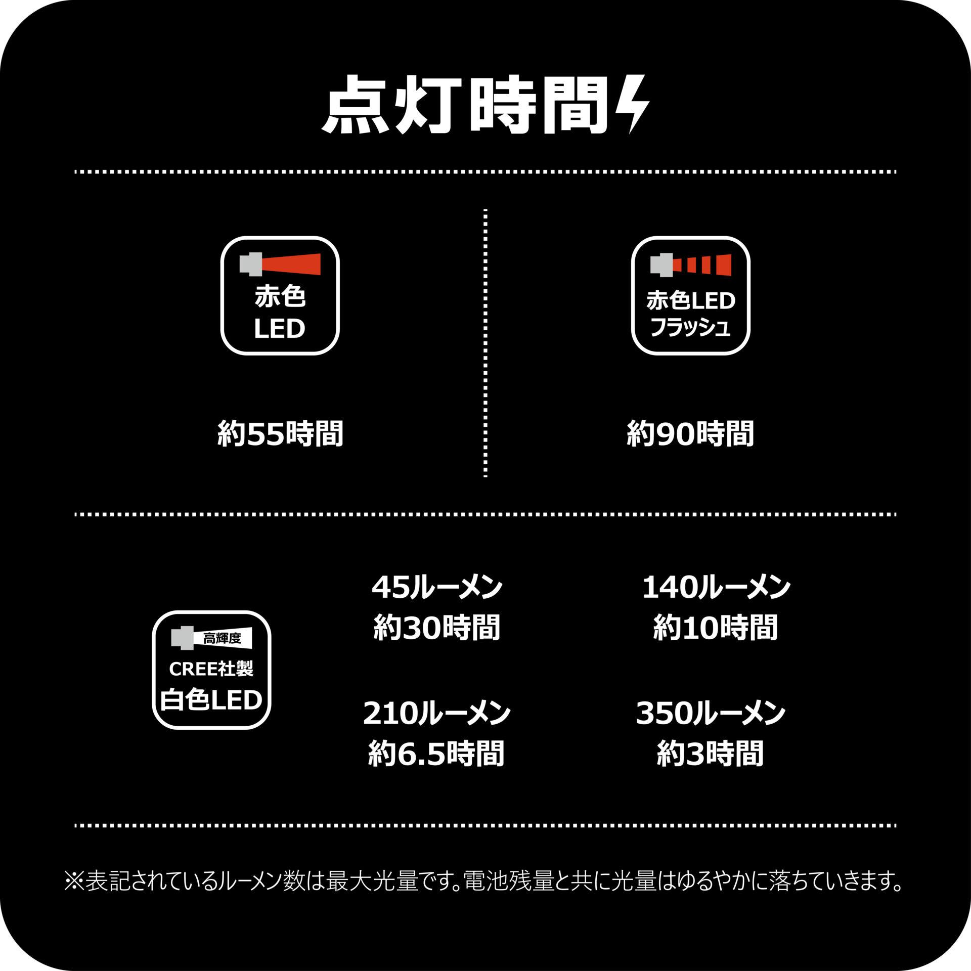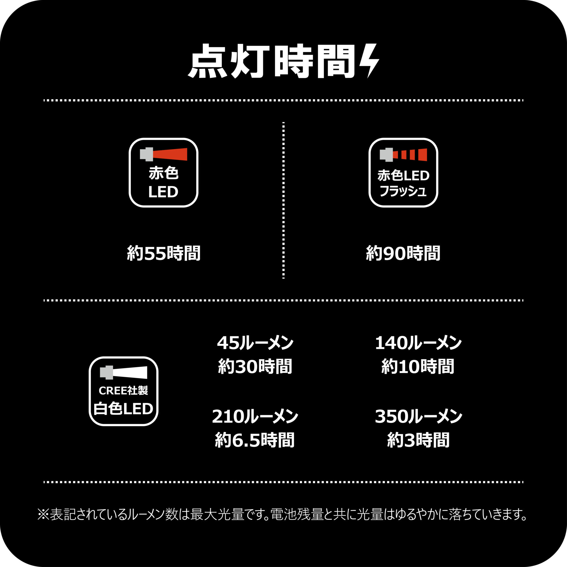 ●バッテリー寿命は、連続点灯で最長30時間(45ルーメン使用時)。