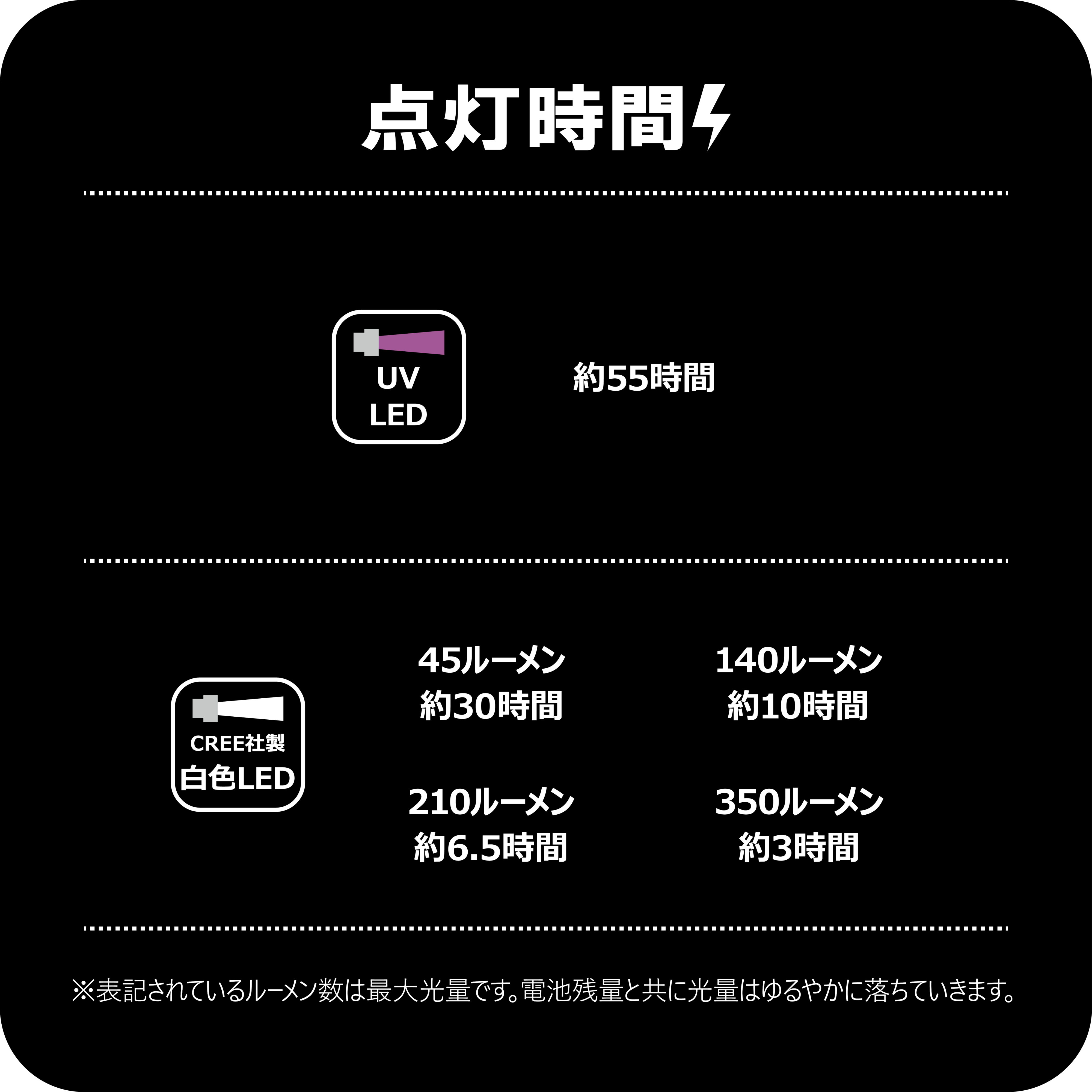 ●4段階の調光モードで最大照度350ルーメンの高照度モデル。