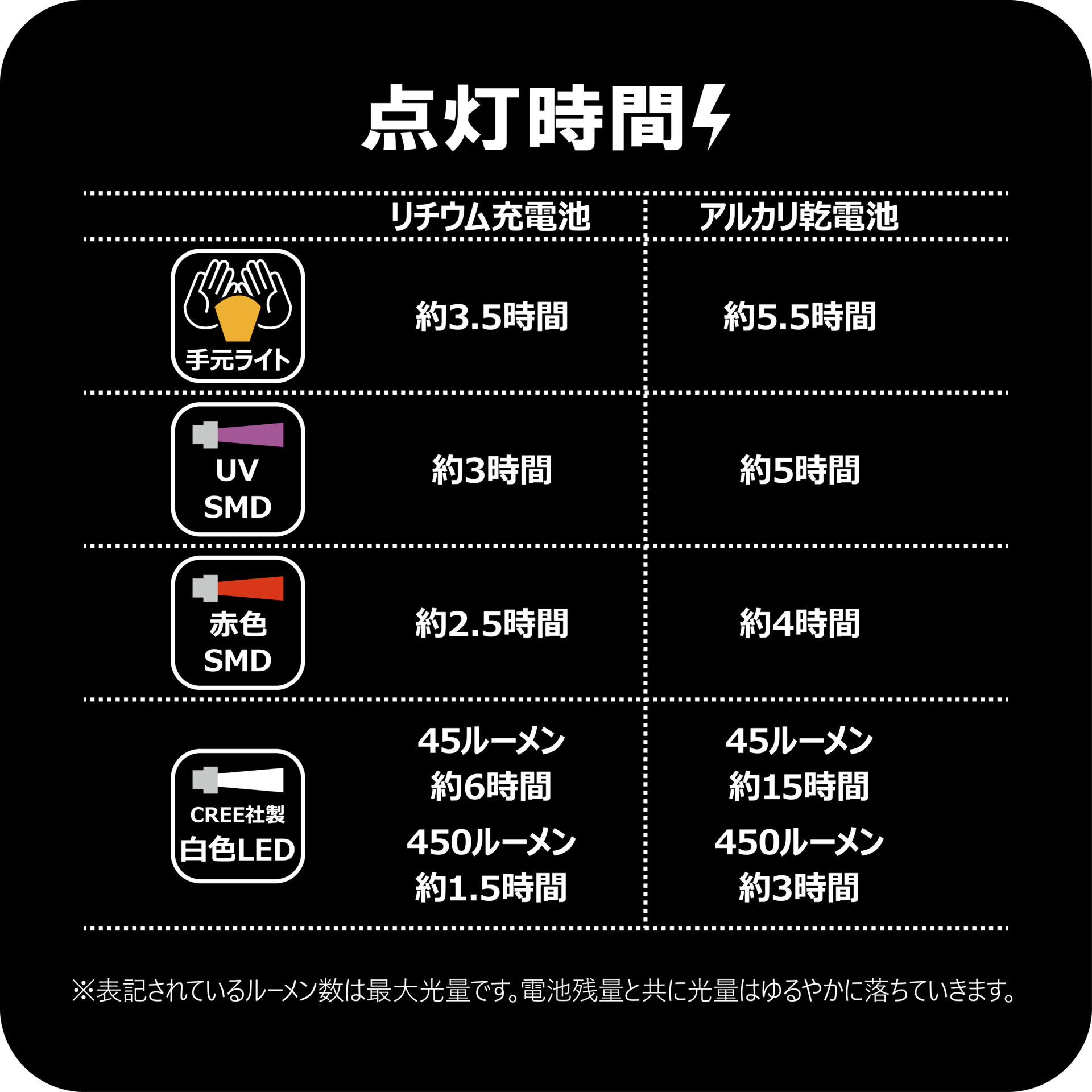 最大光量:450ルーメン