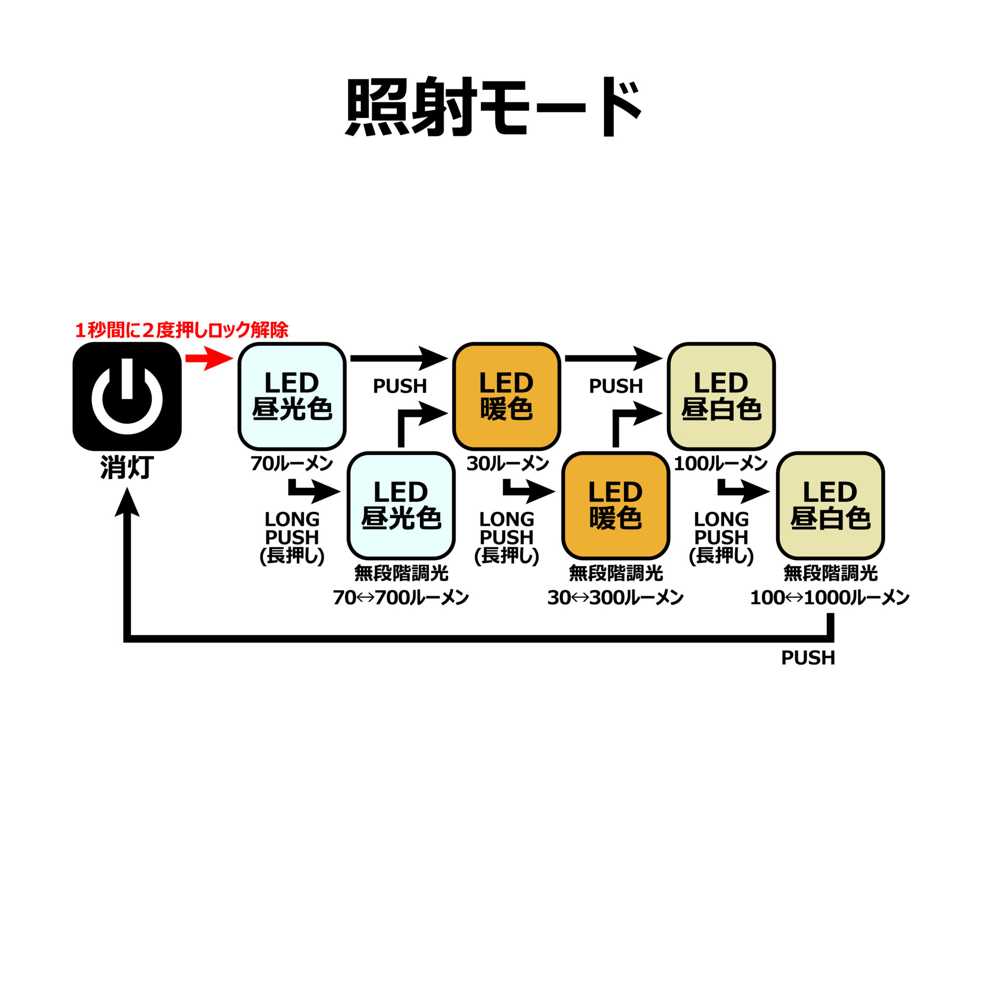 ●バッグ内での誤点灯を防ぐロック機能付(1秒間に2度押しで点灯)。