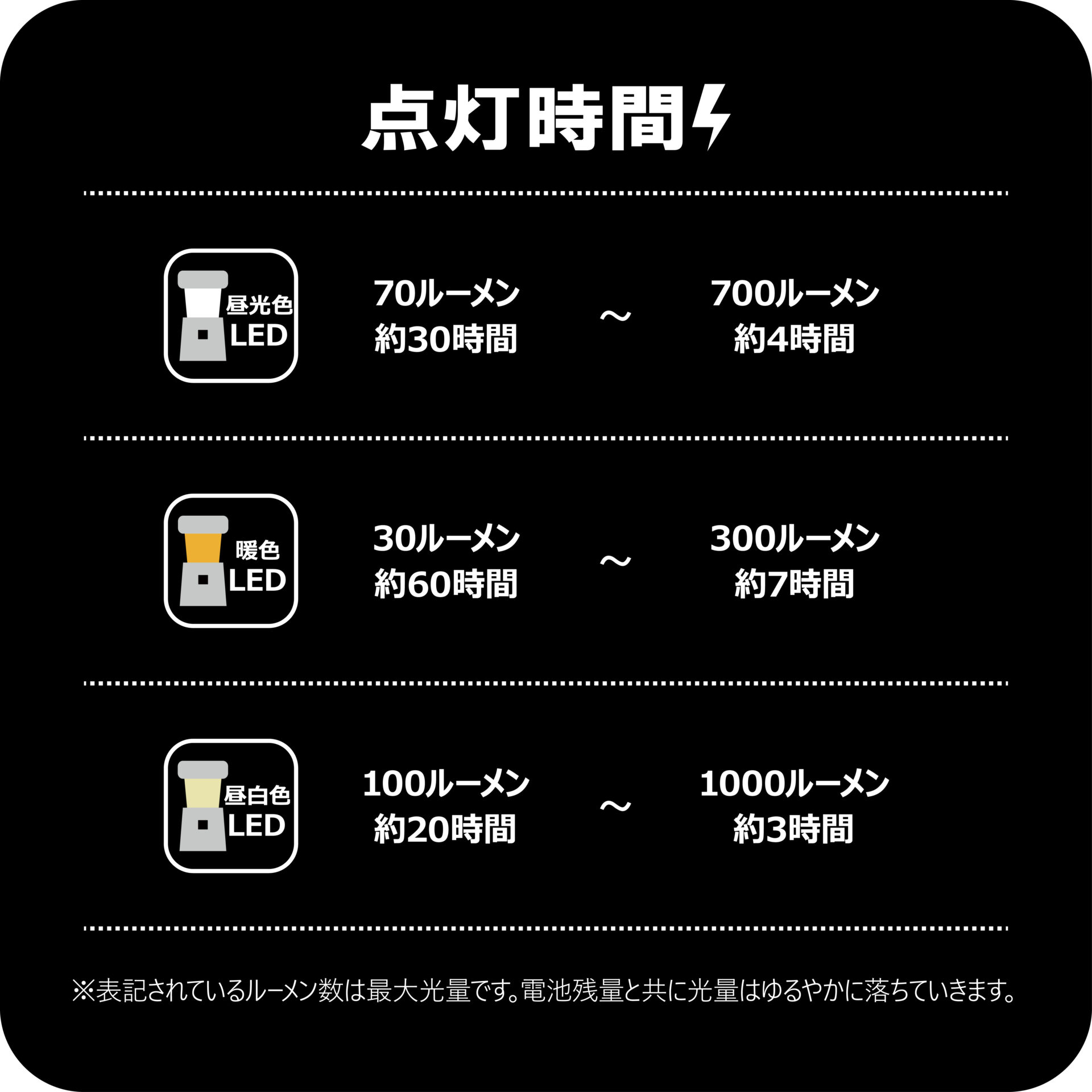 ●昼光色、暖色、昼白色ともボタン長押しで明るさを無段階調整可能。