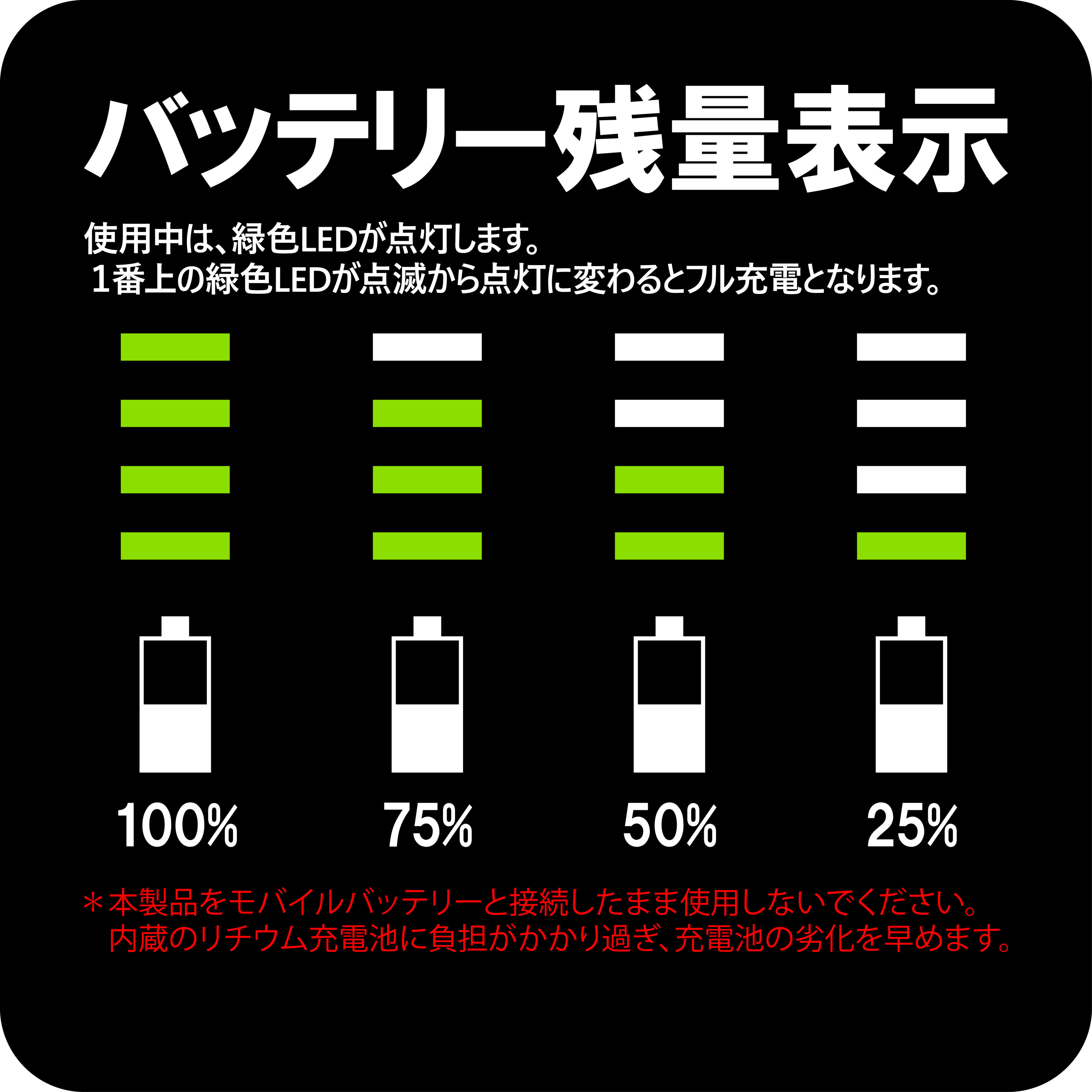 *本製品をモバイルバッテリーと接続したまま使用しないでください。内蔵のリチウム充電池に負担がかかり過ぎ、充電池の劣化を早めます。