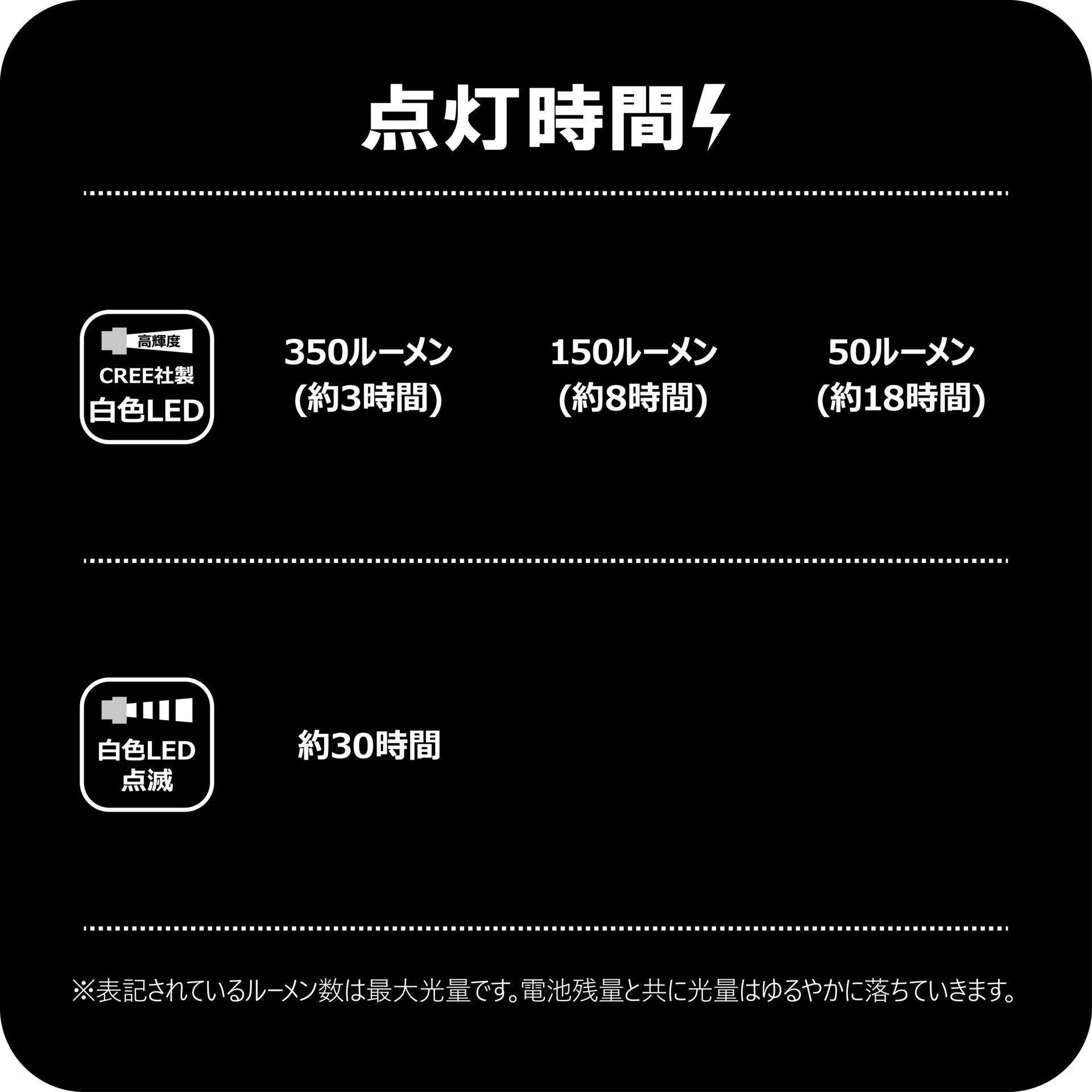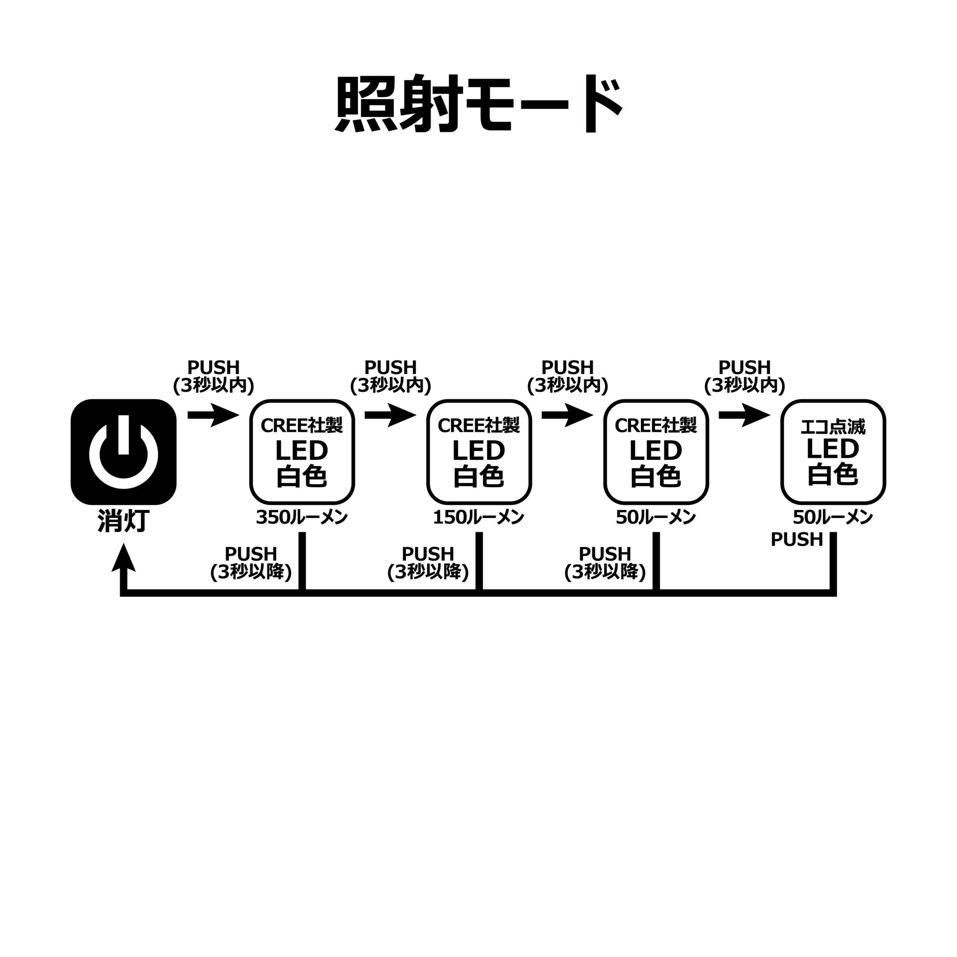 ●点灯時は毎回350ルーメンより照射に設定(メモリー機能なし)。