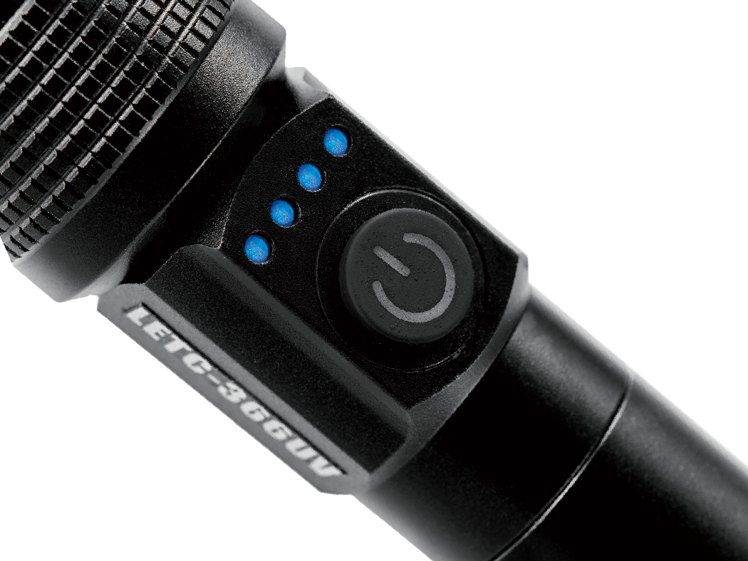 UVライト点灯中に、電源スイッチ上部にあるバッテリー残量確認青色LEDが点灯します。1メモリで25%の残量を表示し、左から25%➡50%➡75%➡100%の残量となります。