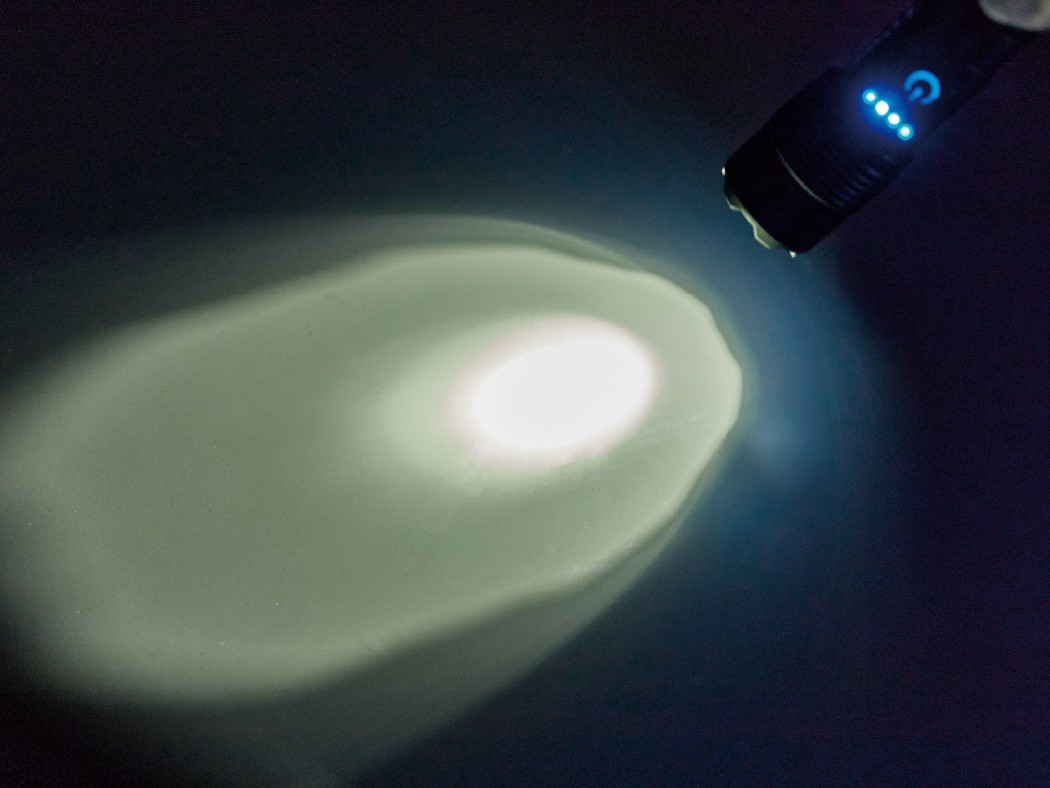 一般的な紫色UVライトが395nm波長、青白い光のUVライトが365nm波長であり、明るい所で比較すると、365nm波長は青白く目視はでよく見えませんが、白い紙などを照らすとその強い光が目視できます。この強い光でアニサキスの検出、蓄光塗料の発光など様々な高い効果を発揮します。暗い所で使用するとさらに分かりやすいです。