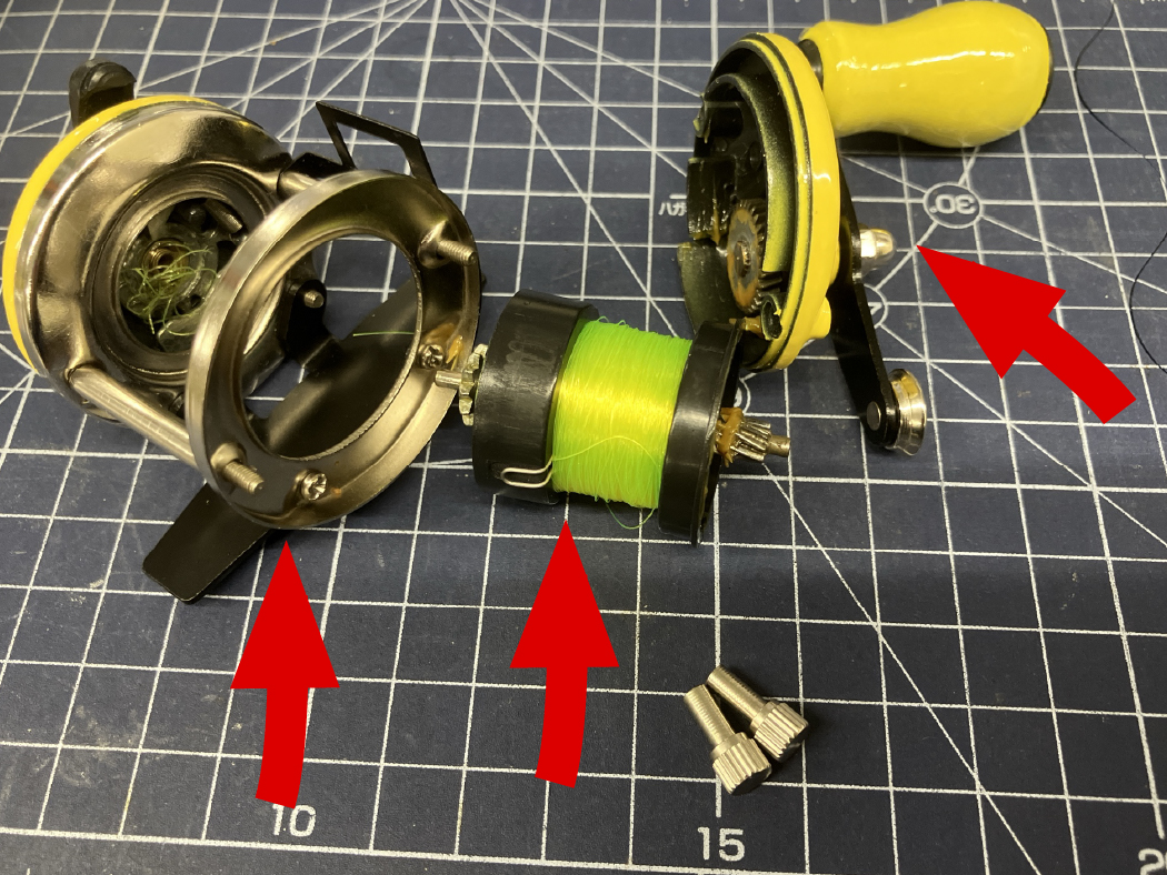 3.ハンドル付プレート、スプール、ボディに分ける。