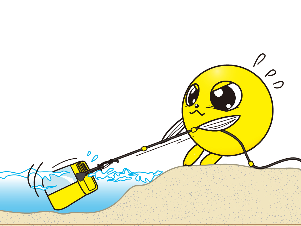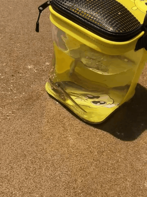 前面はお魚の観察もできちゃうクリアボディー。半面メッシュ蓋は魚を入れたままでも手軽に水を入れ替えられます。砂浜でも砂が入りにくいオリジナル構造で、水を汲むのも安心。側面のループにエアーポンプを取り付けて、お魚に酸素を送れば元気な状態をキープ!夏場は水温が上がりやすいのでこまめに水を変えてあげるのがお魚を元気に保つコツ♪